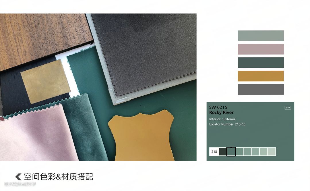 【色彩材质搭配】复古绿色是主色调,点缀色用了灰粉中和冷调,用姜黄和金属提高了空间的亮度。