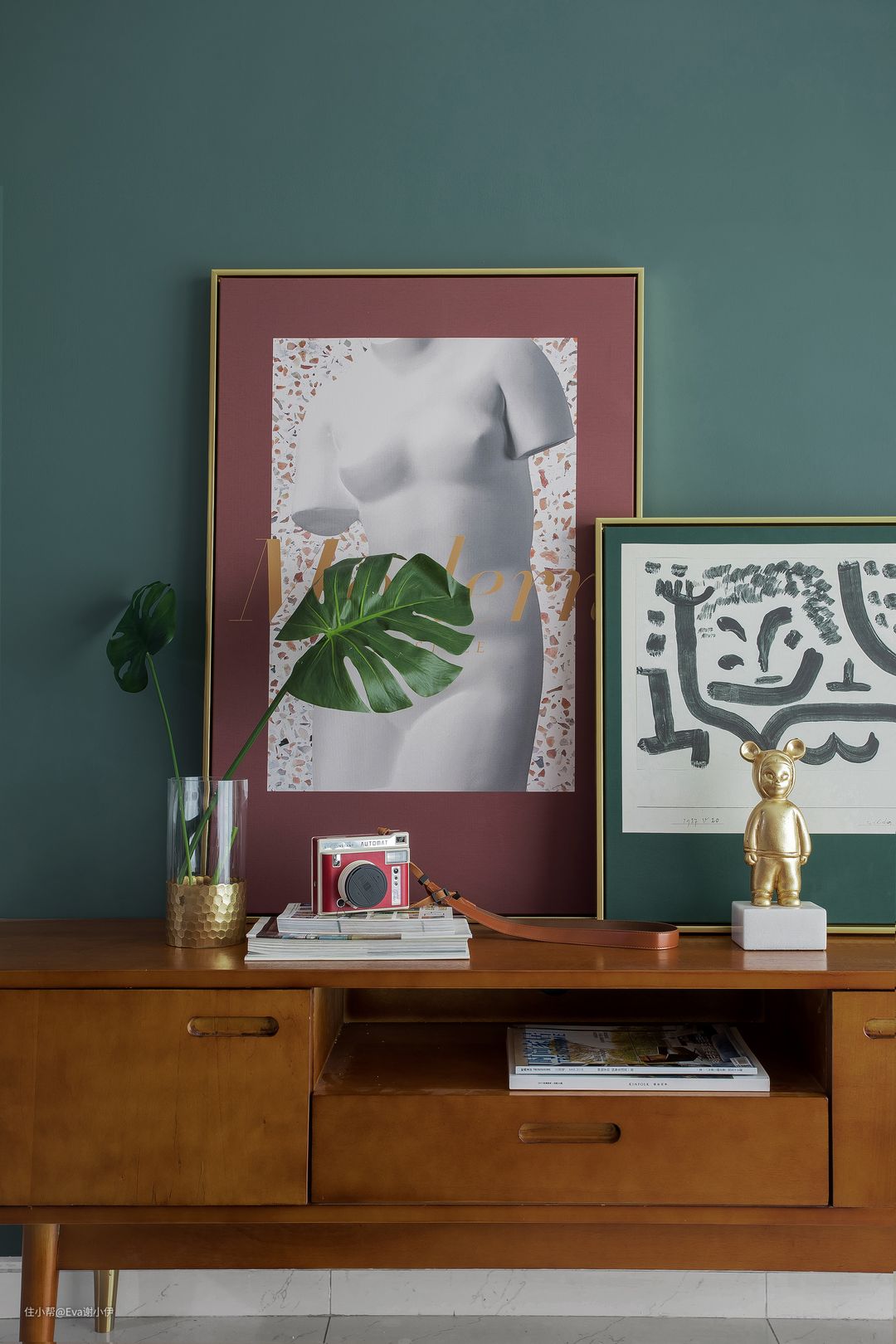 ① 电视【背景墙】不大,设计之初想在这里做一个超长工作台+投影,后来考虑到动静区域的重叠,还是用了最简单的柜架搭配;