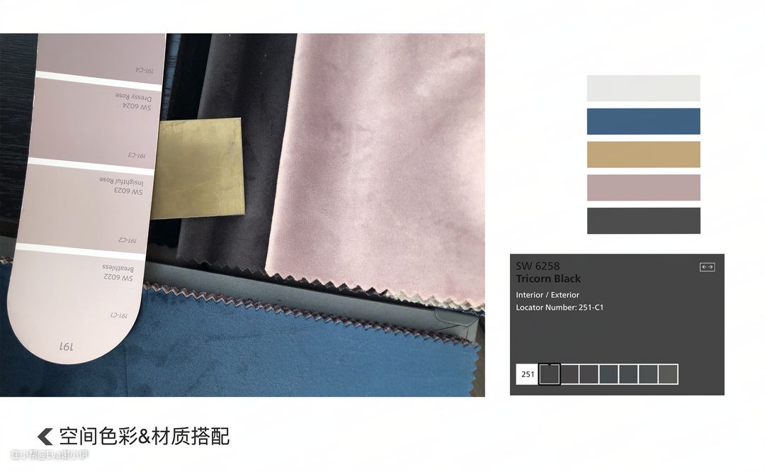 在软装确定之前,我给每个空间都提前做了【色彩和材质的搭配】。在经典的蓝粉cp基础上,尝试了复古绿的撞色;用了很多绒布、金属、大理石材质是为了帮助提升空间的精致感。