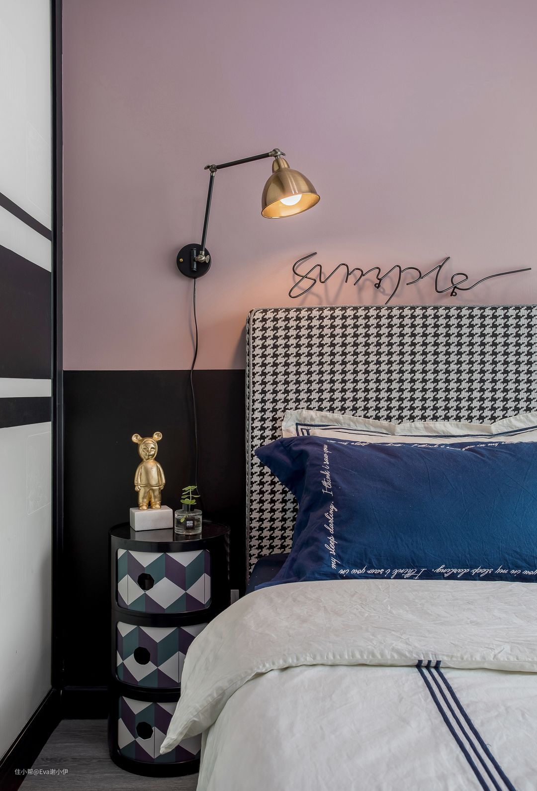 还记得第一次看到这张床时的激动,【千鸟格靠背】应该是万年经典百搭款了,因为它排列极规整,所以背景墙特意用【壁灯+台灯+字母装饰+单幅挂画】随意地组合了一番~