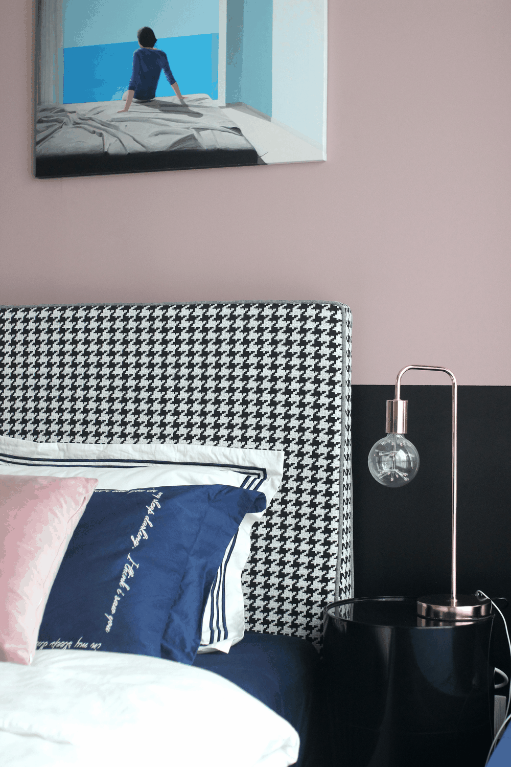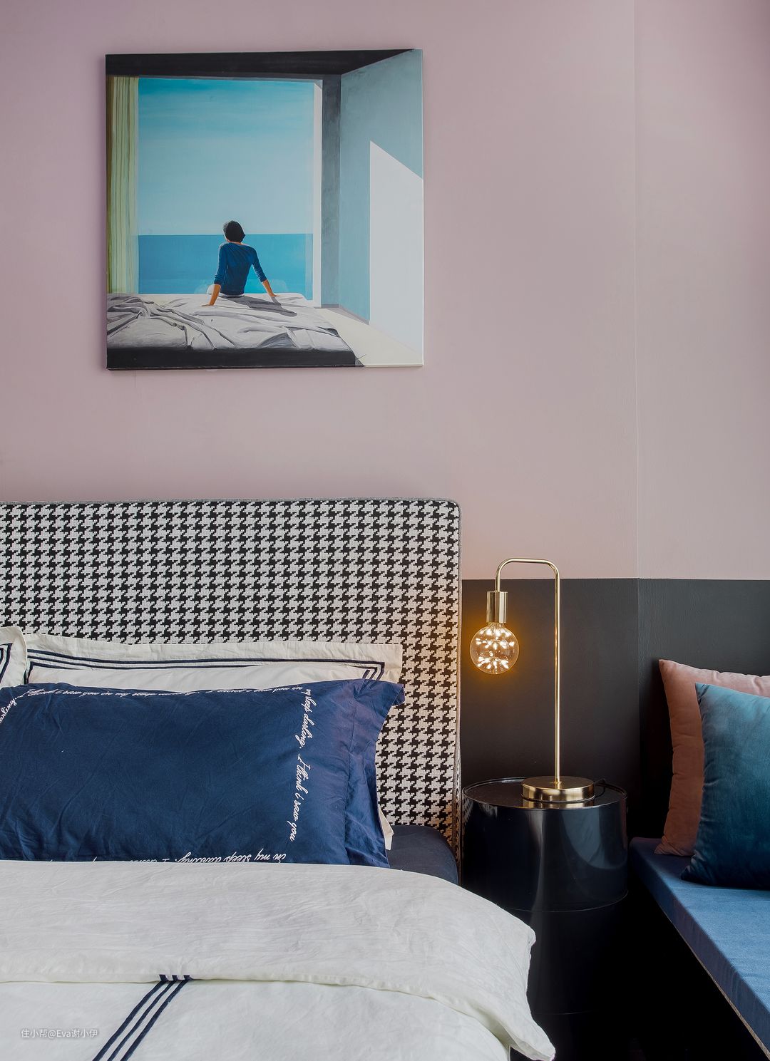 主卧延续了客厅的【蓝粉搭配】,加了三分之一的【深灰】墙面来中和调性。一直认为只要搭配得当,任何颜色都是可以找到发挥空间的,就大胆地用吧。