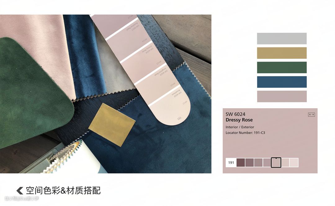 在软装确定之前,我给每个空间都提前做了【色彩和材质的搭配】。在经典的蓝粉cp基础上,尝试了复古绿的撞色;用了很多绒布、金属、大理石材质是为了帮助提升空间的精致感。