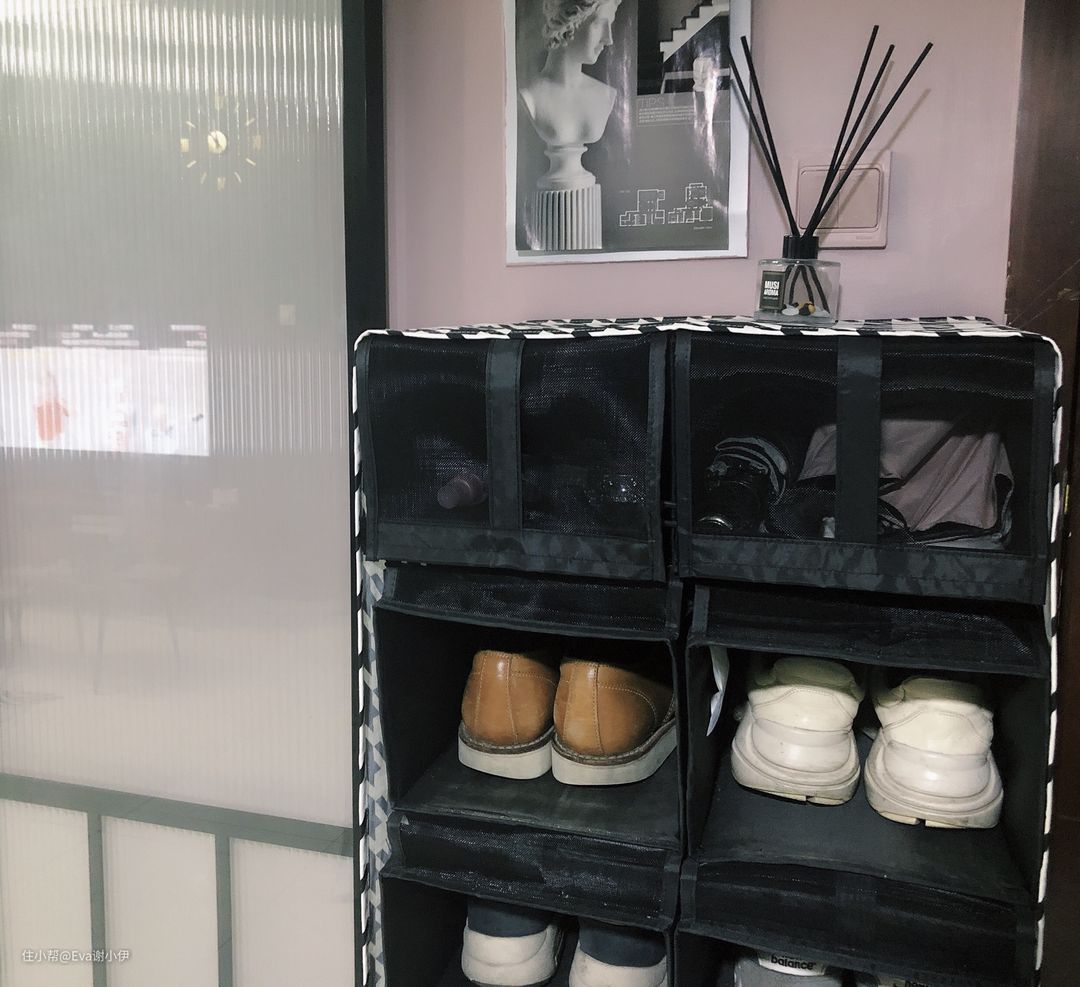 ① 玄关空间极小,常规的鞋柜很难在此容身,最后我找了宜家思库布【鞋盒+隔板】,搭造了一个利用率很高的简易鞋柜,用于摆放我们当季常用的鞋子和日常雨伞(不常用的部分定期整理进鞋盒放在生活阳台的储物区)。