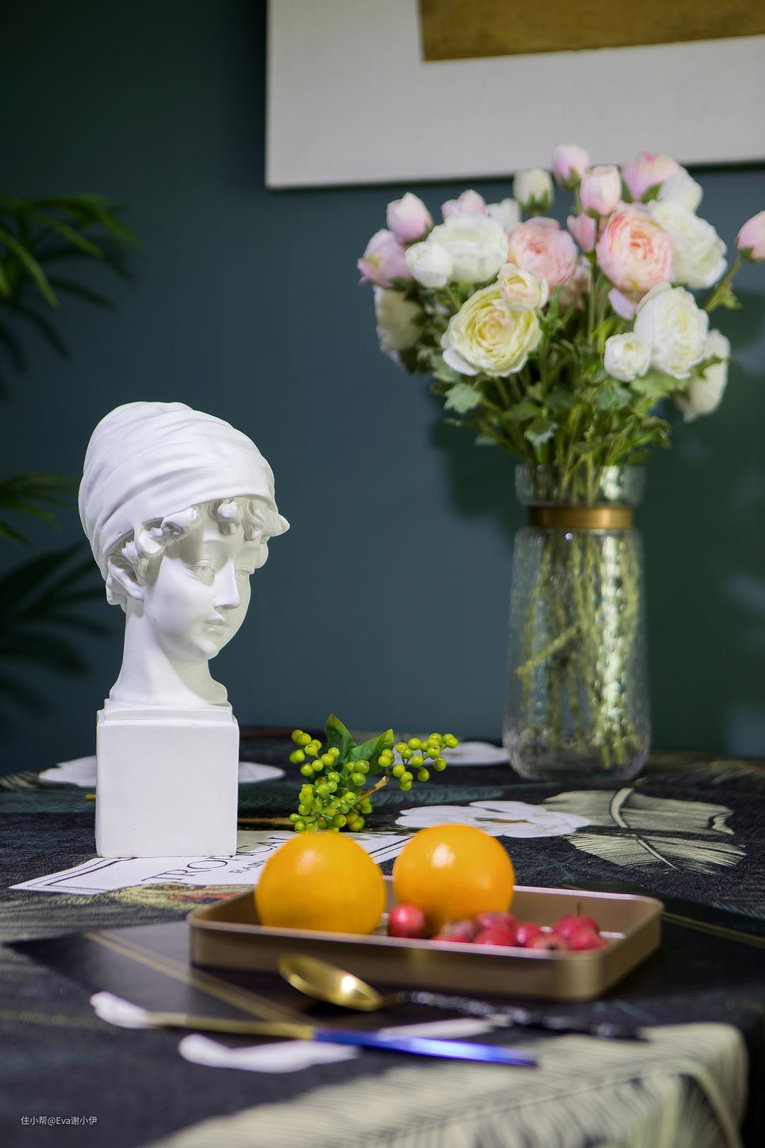 【色彩材质搭配】复古绿色是主色调,点缀色用了灰粉中和冷调,用姜黄和金属提高了空间的亮度。