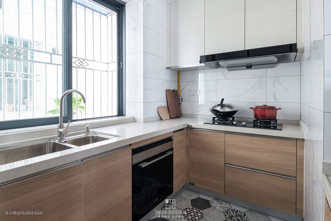 地面水泥质感的六角砖平铺,趣味十足。橱柜木纹色的地柜与白色的吊柜形成对比,质感更强烈,视觉上扩大空间感。#北欧 #厨房 #六角砖 #爵士白