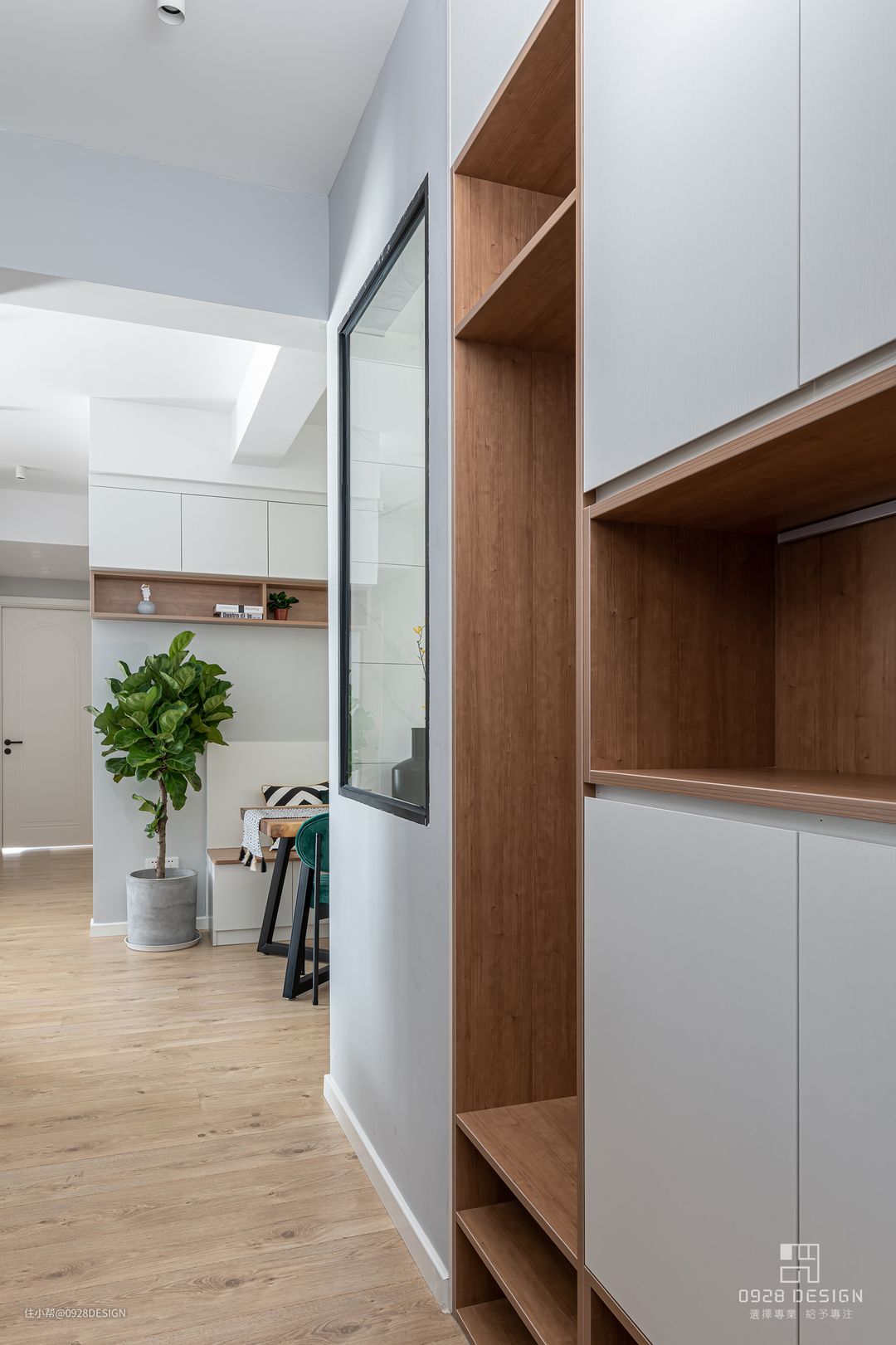 玄关鞋柜借用厨房部分空间与墙最平,厨房墙面开窗,增加玄关自然采光。鞋柜设计上将换鞋凳与鞋柜结合,换鞋凳与鞋柜下镂空两层便于换鞋,中间部分镂空,藏有灯带,可随手放置物品。左侧墙面设计穿衣镜与挂件。 #北欧 #玄关 #鞋柜