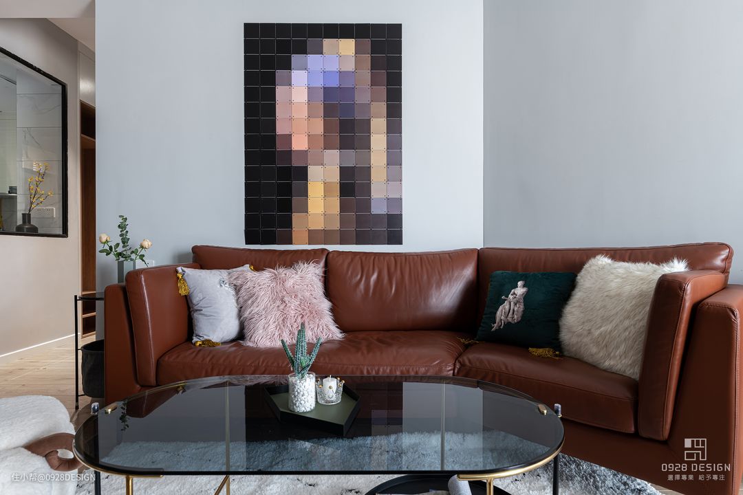 客厅采用灰色墙面作为基底,棕色皮质沙发与胡桃实木家具作为主调,点缀墨绿色软装饰,墙面的马赛克挂画。时尚也耐看。浅棕色作为空间的强调色以点睛之势冲击眼球,明丽清醇的色调令人无限惊喜,给人希望与安宁。#客厅 #北欧 #沙发 #茶几