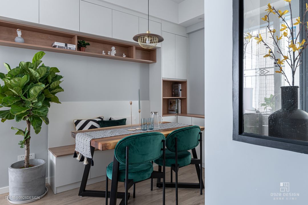 靠窗设计餐边柜,餐边柜与卡座相连,卡座上吊柜设计存放不常用物件,避免碰头,在吊柜底部设计比吊柜薄一些的镂空层板放置小件物品。#北欧 #餐厅 #卡座 #餐桌