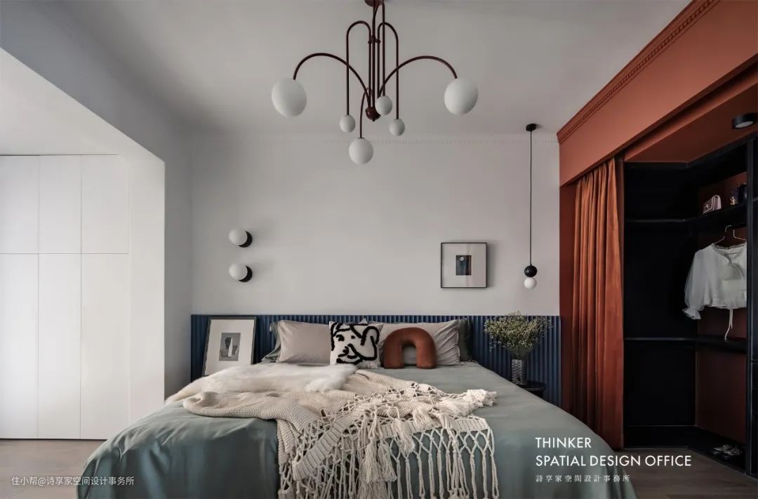 · 并入了阳台的卧室,显得格外宽敞,而雾霾蓝与砖红色的搭配,有着更饱满的视觉感受。