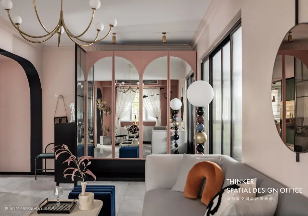 · 极富韵律的曲线元素也是这次设计中的亮点,从造型的精致弧度,到优雅线条的吊灯,再到充满趣味的拱形镜面,拓展空间感的同时,也能借助镜面的反射引光入室。