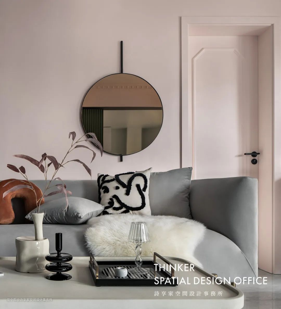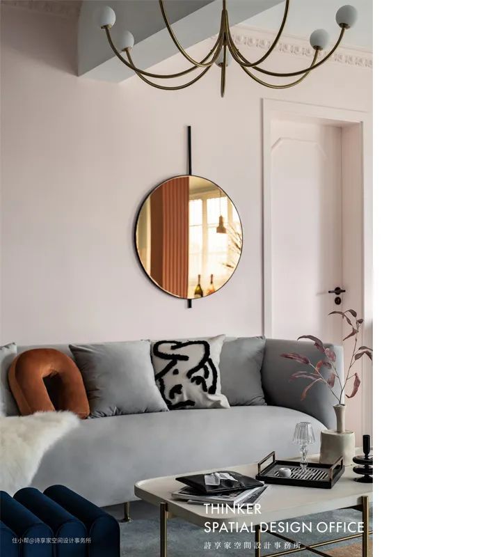 · 经典的灰粉配色让空间显得年轻有活力,而材质的质感则很好地烘托出色彩的表现力,再点缀少量的宝蓝和黑色,更显时尚。