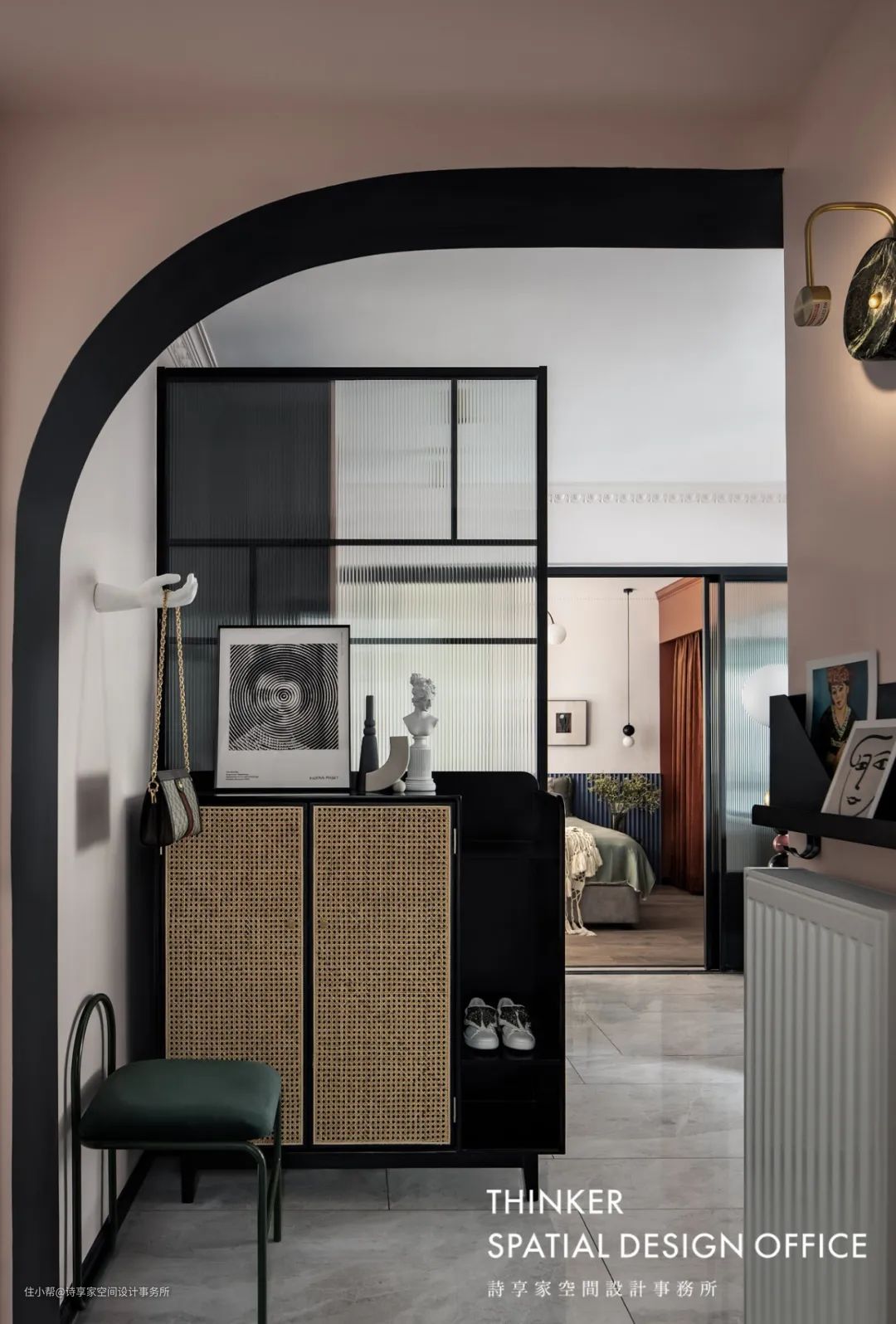 · 借用一点客厅的位置规划出一个玄关,方便放置常用的包包,鞋子等小物,Joe特别选了一款藤编柜,老物件的年代感,往往也是时尚的一部分。