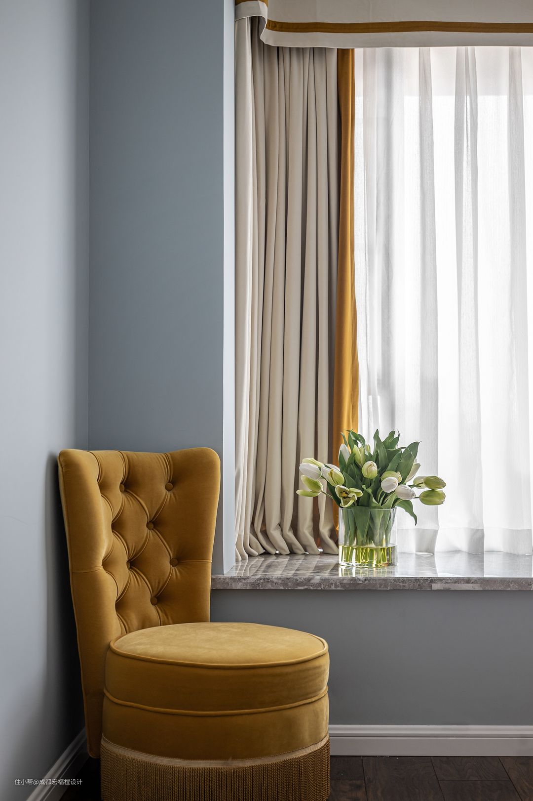 水晶灯、金属边框中世纪挂画、复古黄色丝绒单椅,可放任思绪无意识地去感受各种可能的联系。#思南 #宏福樘设计 #卧室 #床 #沙发