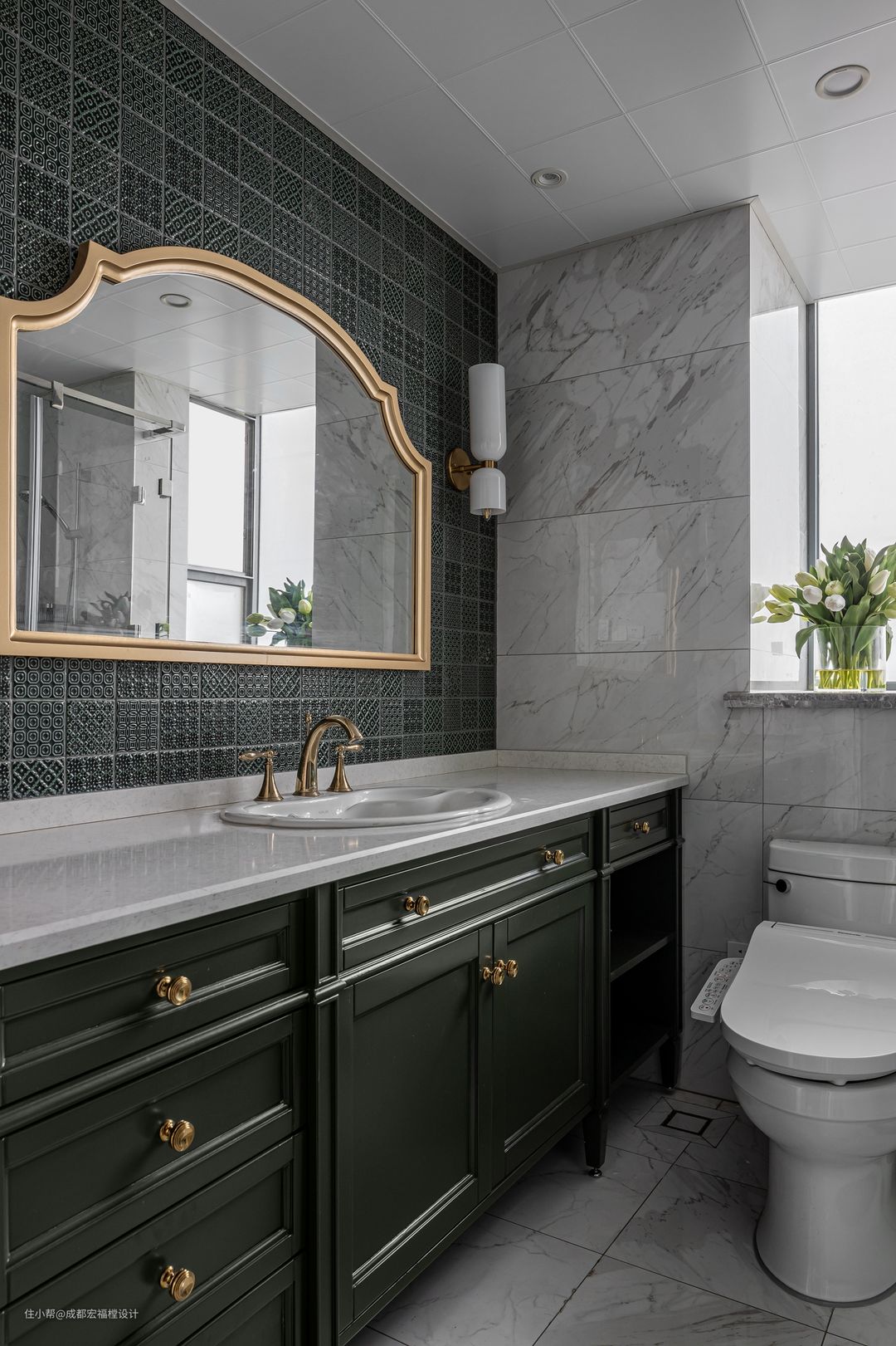 沿用客厅整体风格保持着卫生间素雅的风格,空间功能完备。镜面后整墙铺贴墨绿复古小花砖,呈现着复古经典的着迷魅力。#思南 #宏福樘设计 #卫生间