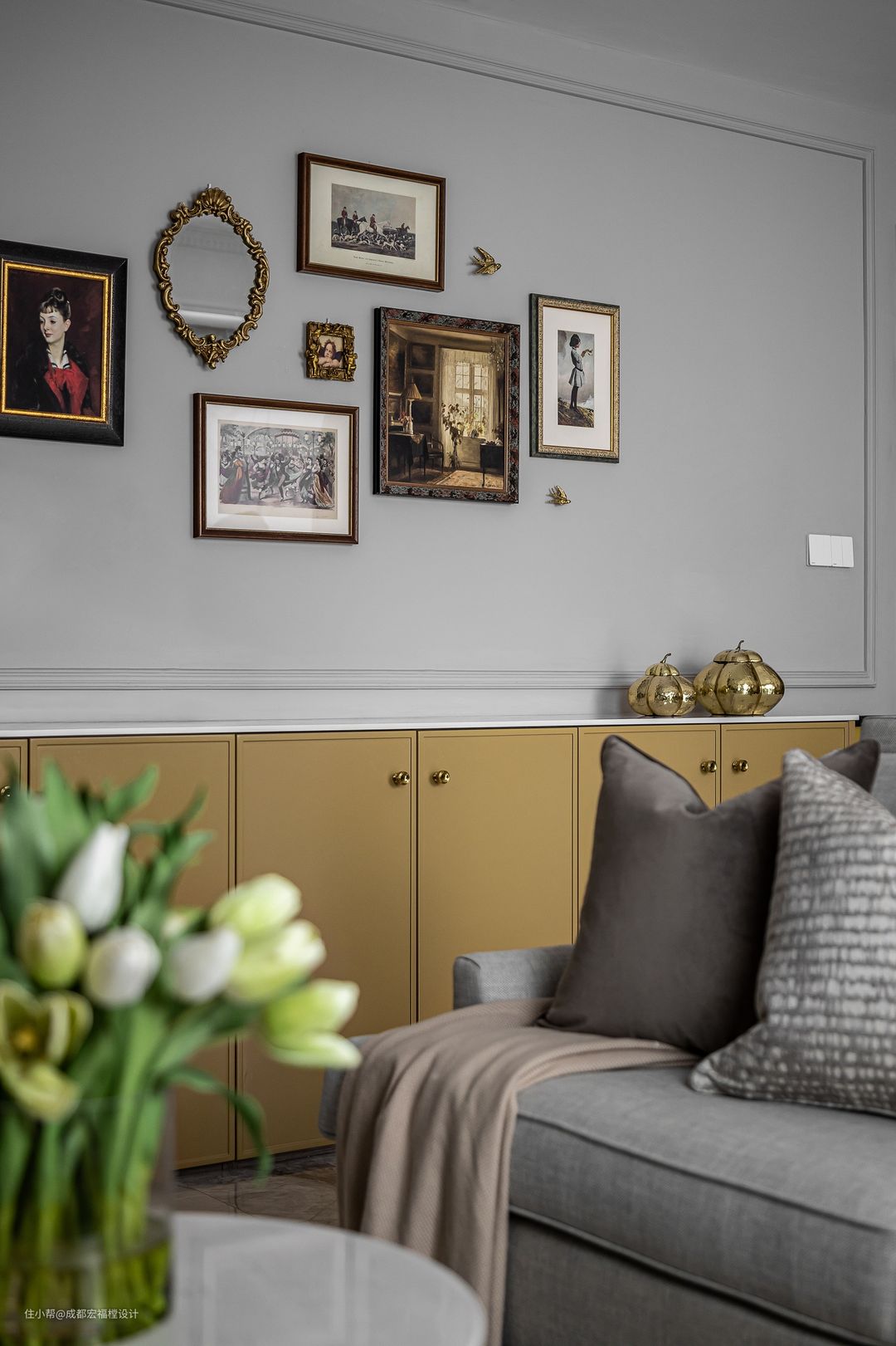 墙面用简单的石膏线条修饰,中世纪复古壁画进行镶嵌点缀,并与橡木黄进行空间色彩呼应,材质复古优雅。#思南 #宏福樘设计 #客厅 #壁画 #绿植