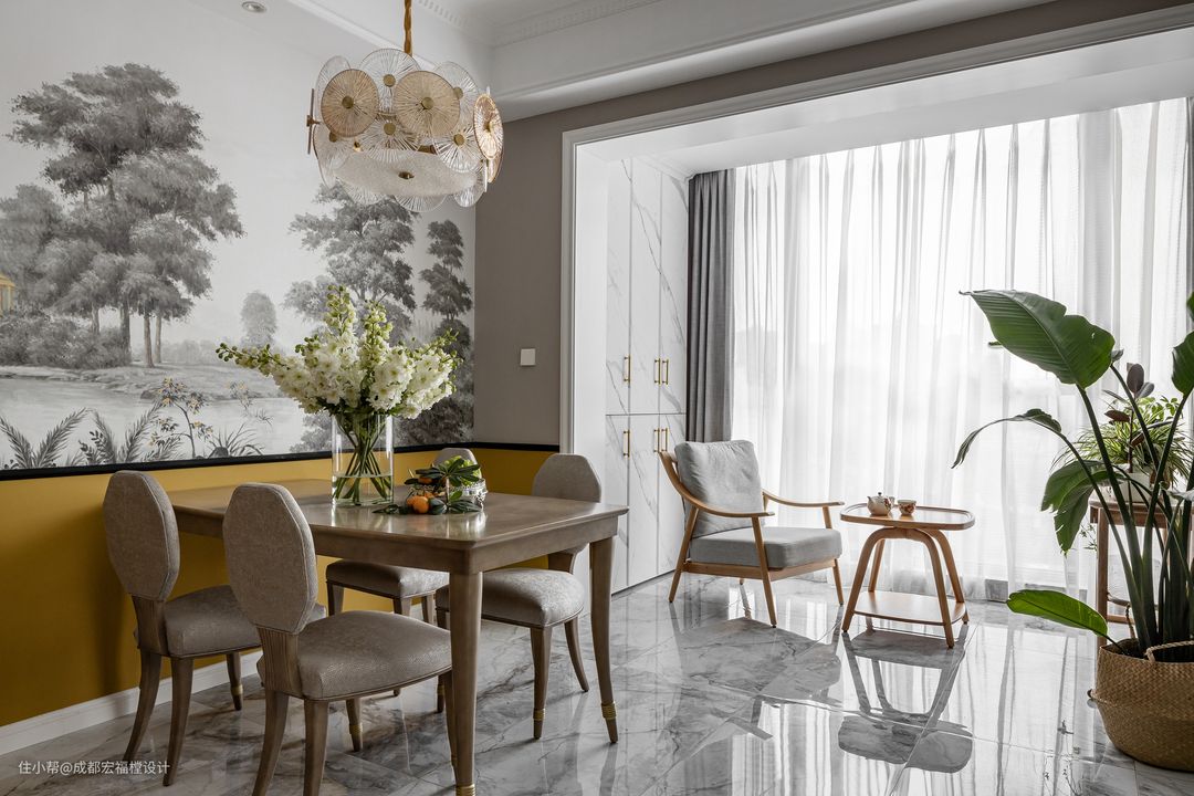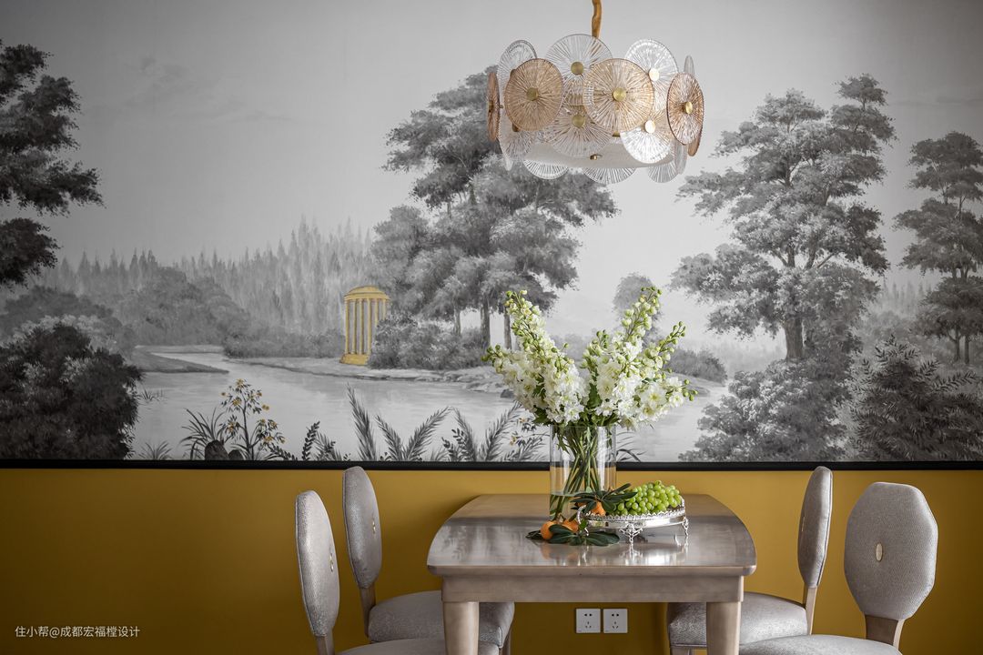 黑白壁画与橡木黄色彩碰撞,将画里的自然感带进家,也同时开启了印象中的山水之美。#思南 #宏福樘设计 #餐厅 #餐桌 #餐椅