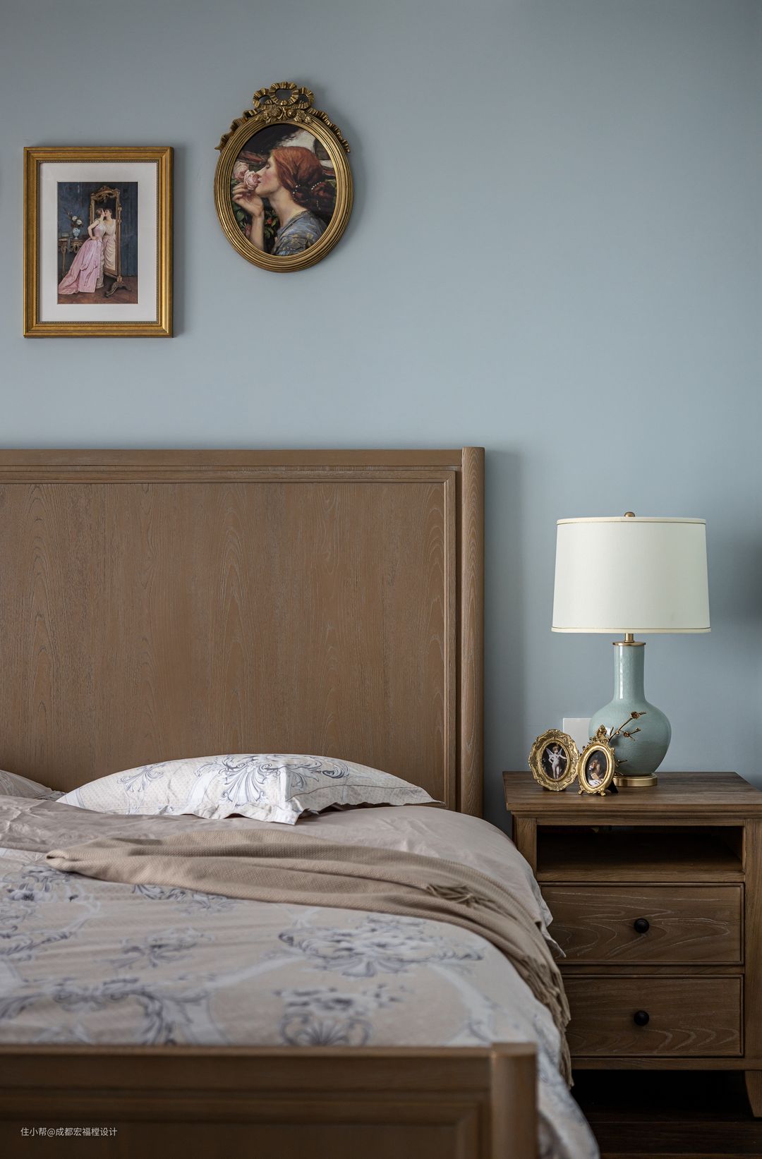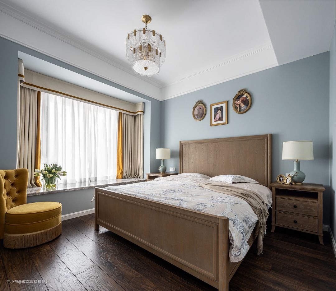 卧室整体连贯了外部空间的关键特质,用橡木黄搭配淡蓝色的墙面,复古、舒适、优雅。#思南 #宏福樘设计 #卧室 #床 #吊灯