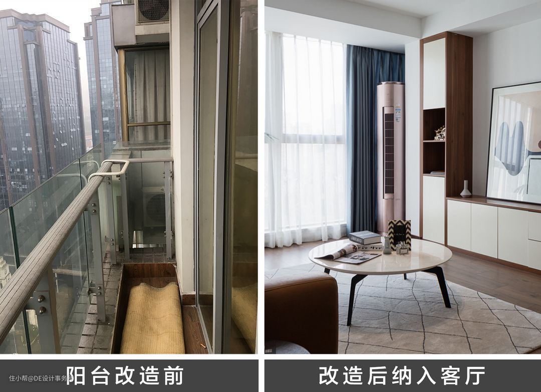 ③ 设计师将鸡肋的一步阳台纳入客厅范围,扩大客厅区域的同时业主再也不用为阳台清洁发愁。