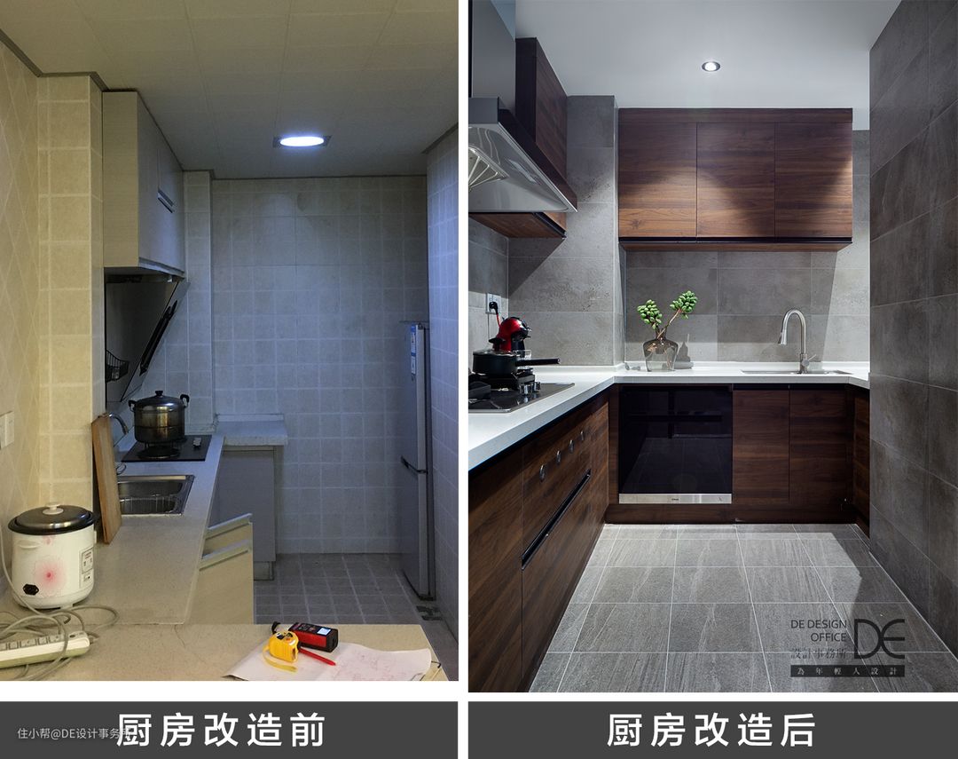 原生活阳台为狭长空间,但长方形空间最大的用处在于两端。所以厨房稍微外扩,增加厨房操作台面,也使生活阳台比例更加协调。