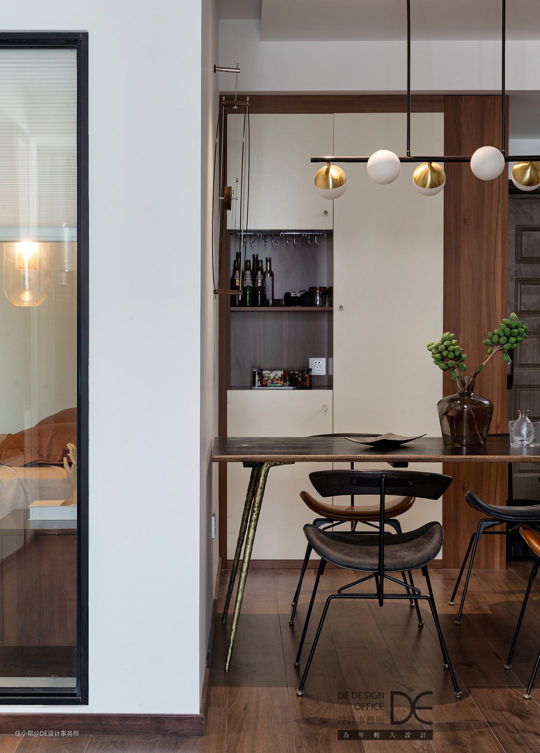在设计师的改造下,厨房、卫生间通过生活阳台引入光线,厨房与餐厅之间用玻璃门隔开,餐厅与客厅相连,客厅与主卧、次卧局部隔墙用玻璃代替。这个传递的秩序使各个空间穿插结合。