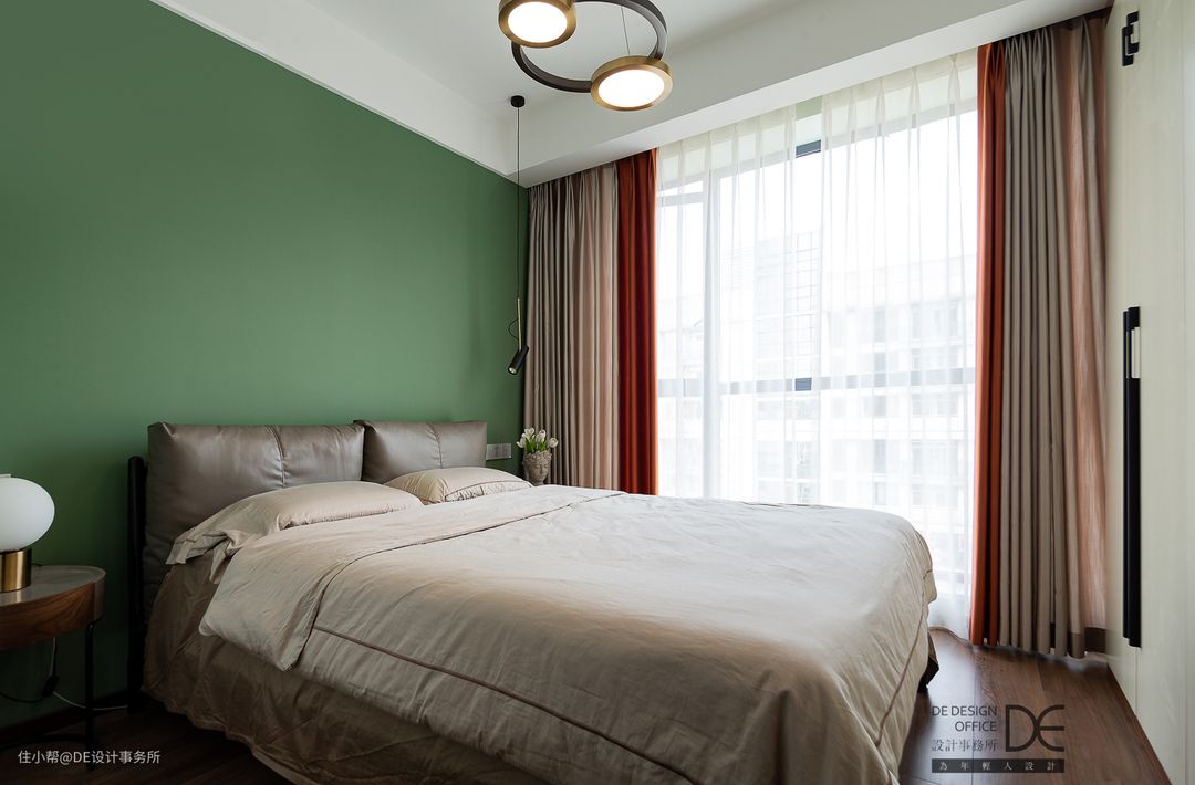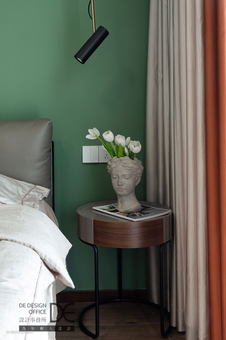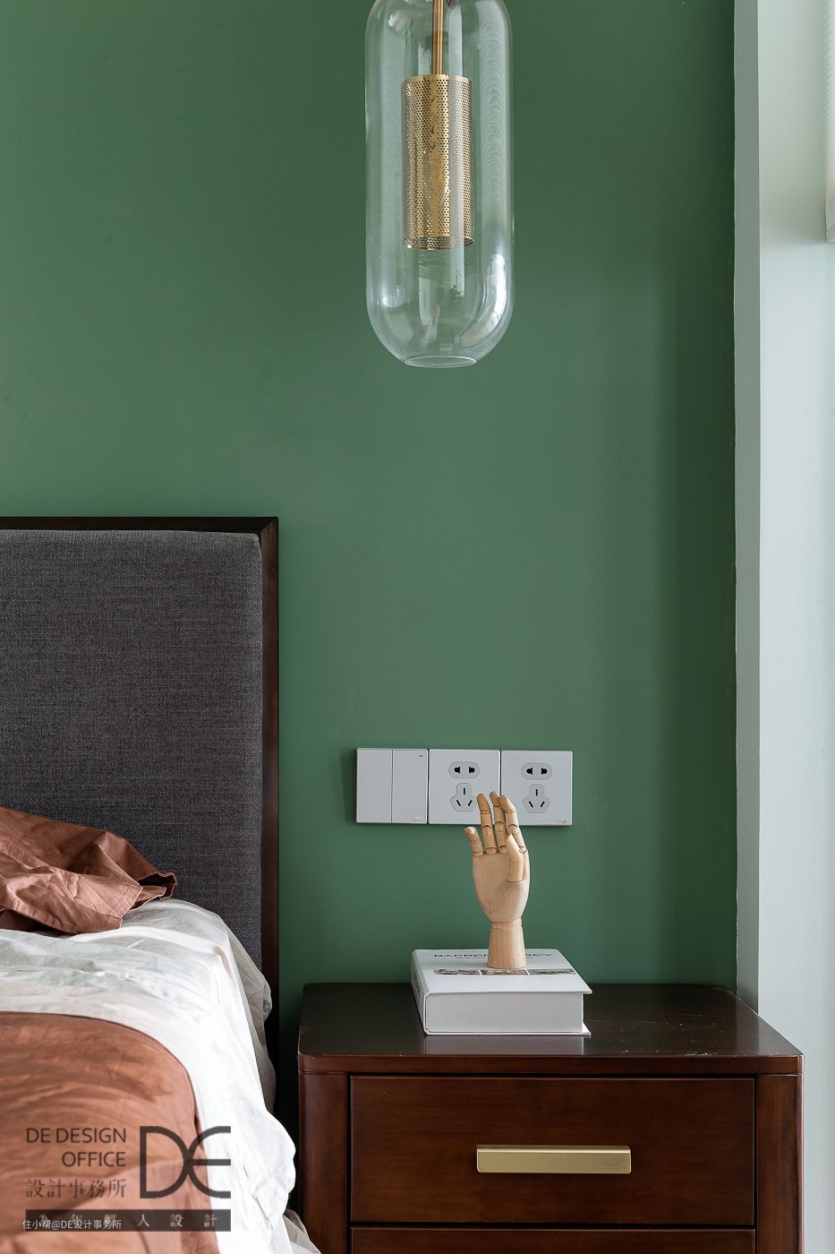 主卧主打复古调的绿色,玻璃金属质感的床头灯与主灯相呼应,营造精致而不失梦幻的睡眠空间。