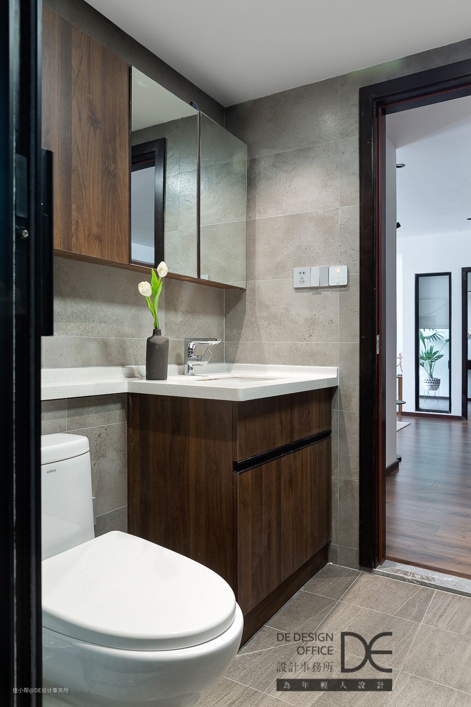 根据承重结构与落水管区域,设计师规划出了超大的壁龛空间,马桶与洗手台背后镜柜做成整体,丰富储物空间。
