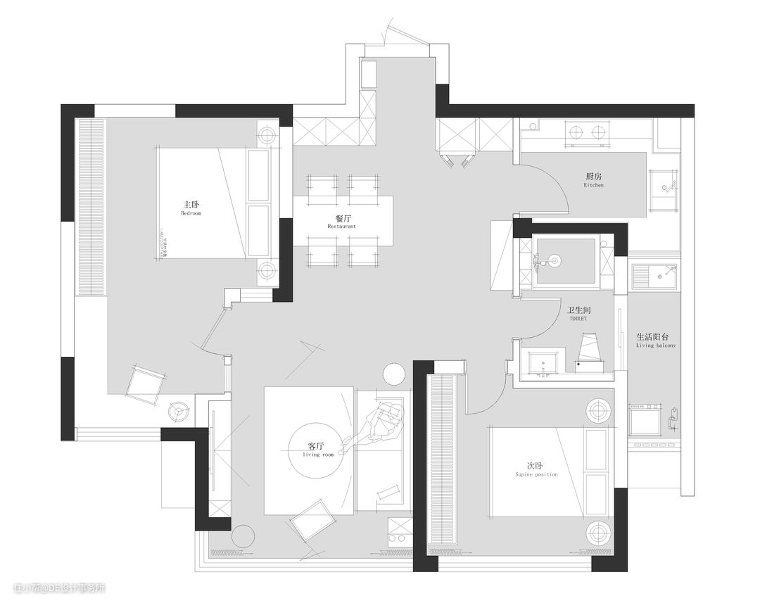 ② 设计师调整了卫生间隔墙,改为通过卫生间滑门进入生活阳台,因为生活阳台为内凹,所以从卫生间到生活阳台,隐私不会受到影响。