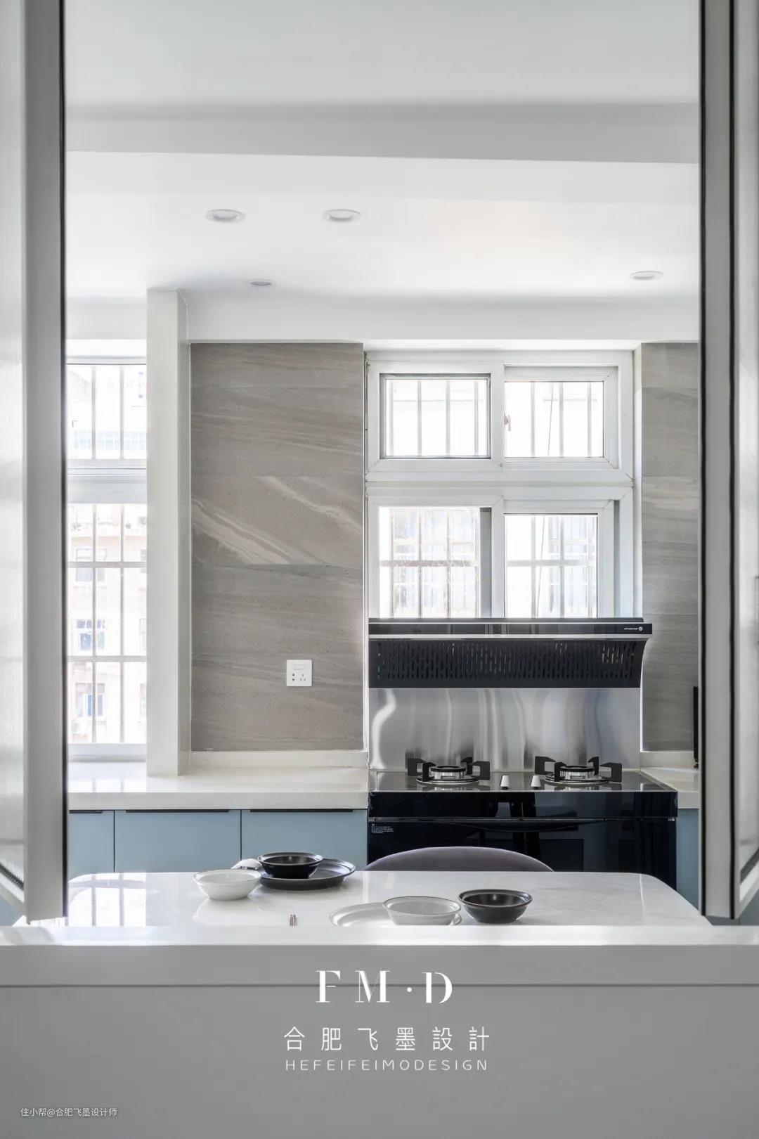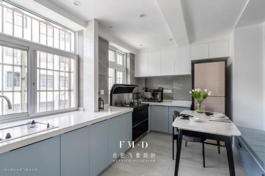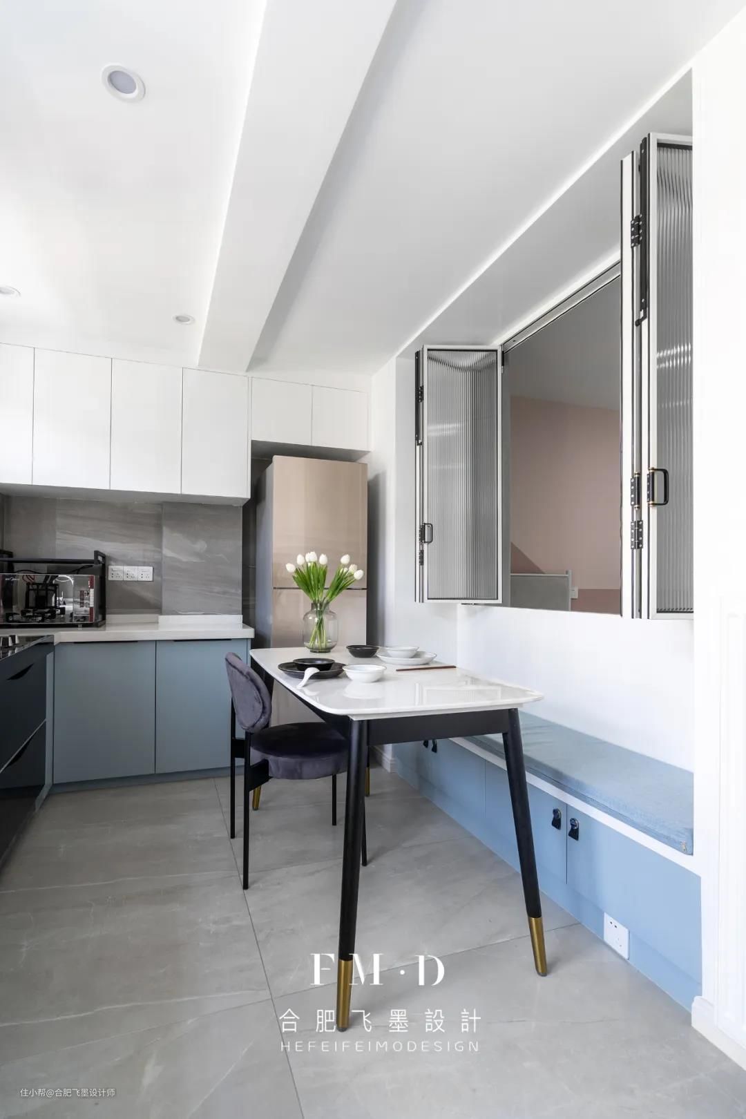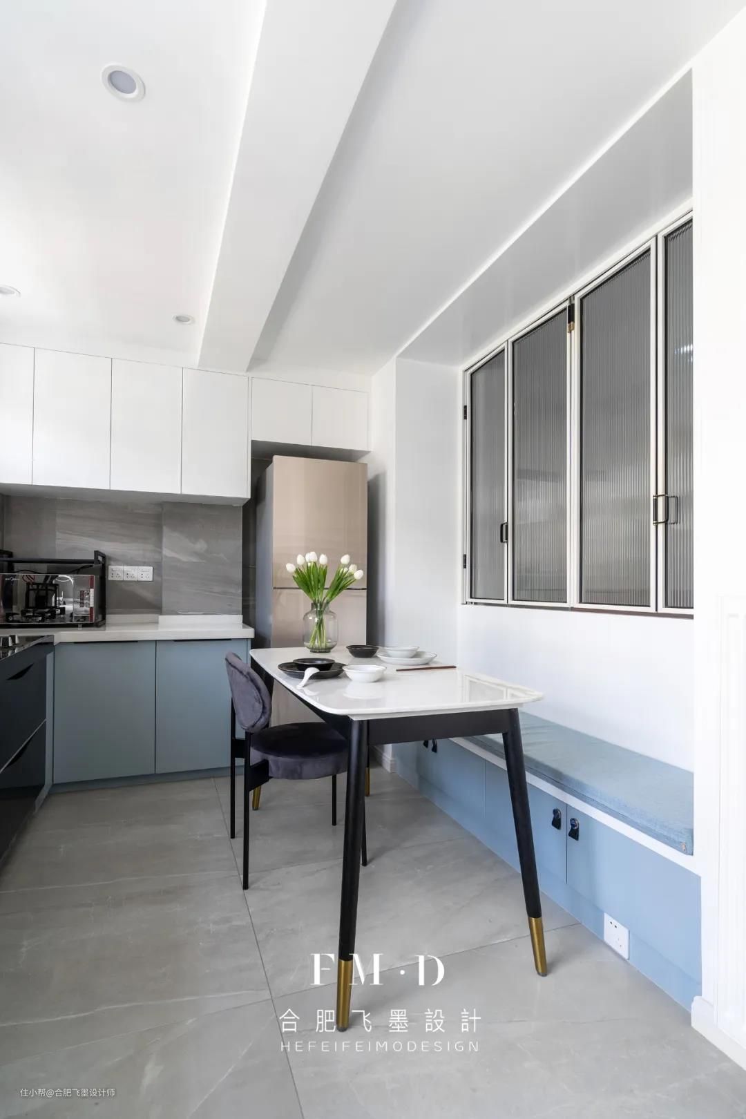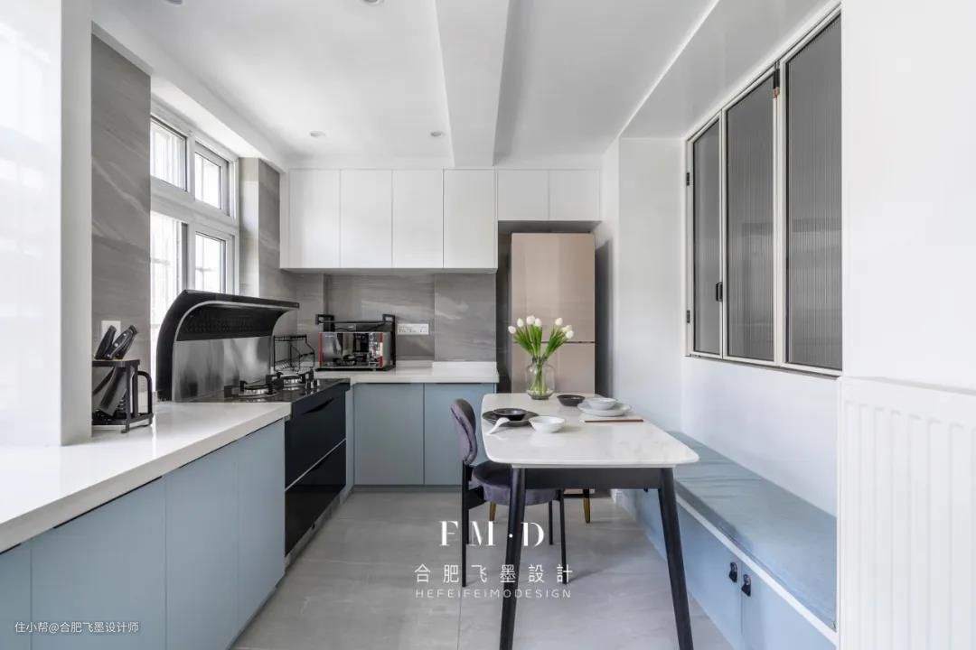 餐厨一体的设计,大大缩短下厨与用餐的动线,在整体白色基调下,没有任何多余元素堆砌,浅蓝色橱柜显得更柔和素雅。