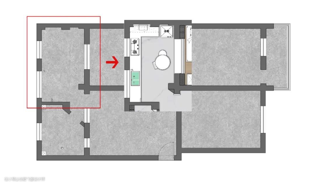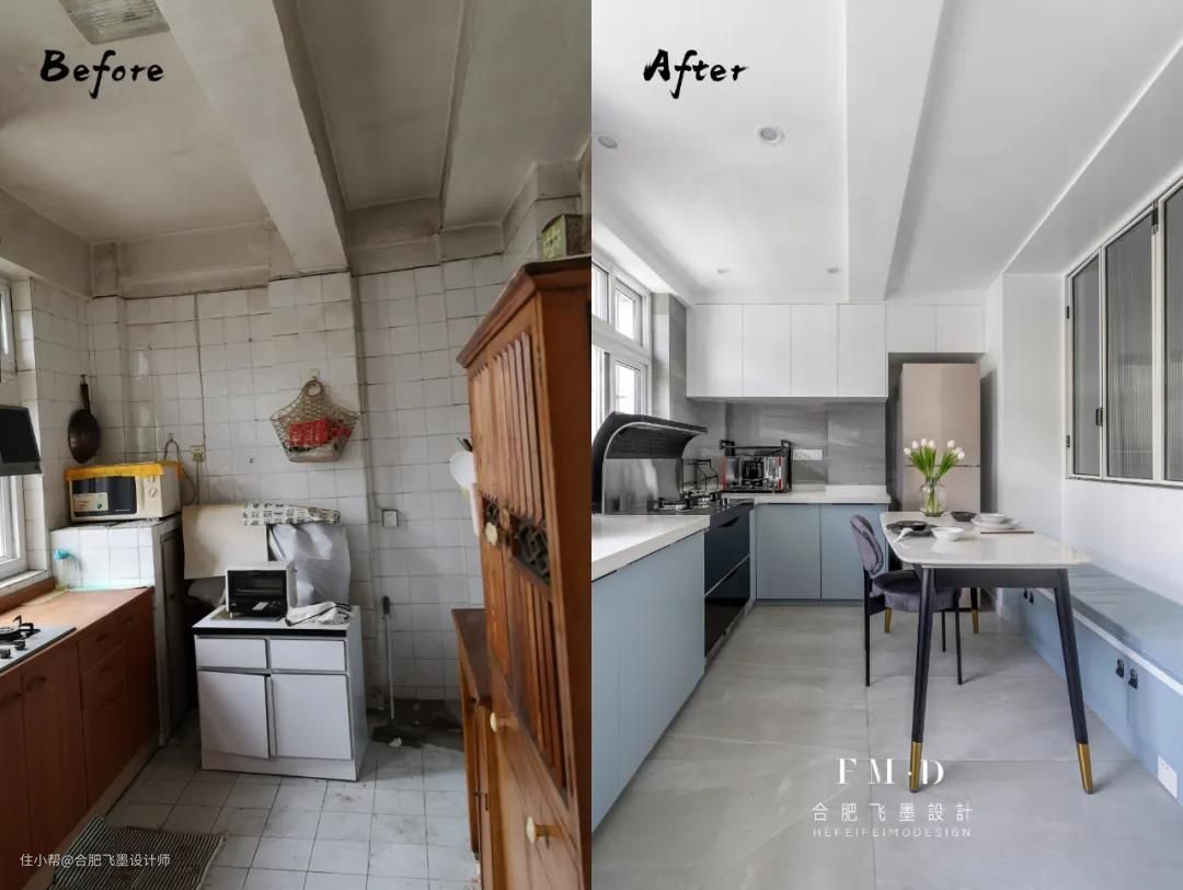 为了不让油烟机遮挡厨房的采光,选择了烟灶一体的集成灶。在灯光的设计上会发现,整体的灯光向橱柜一侧偏移不会出现灯光死角的情况。餐厅利用次卧的非承重墙空间嵌入卡座,增强空间利用率。