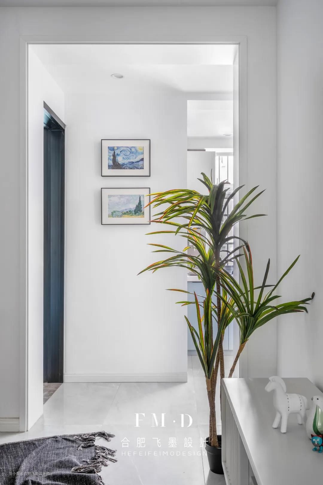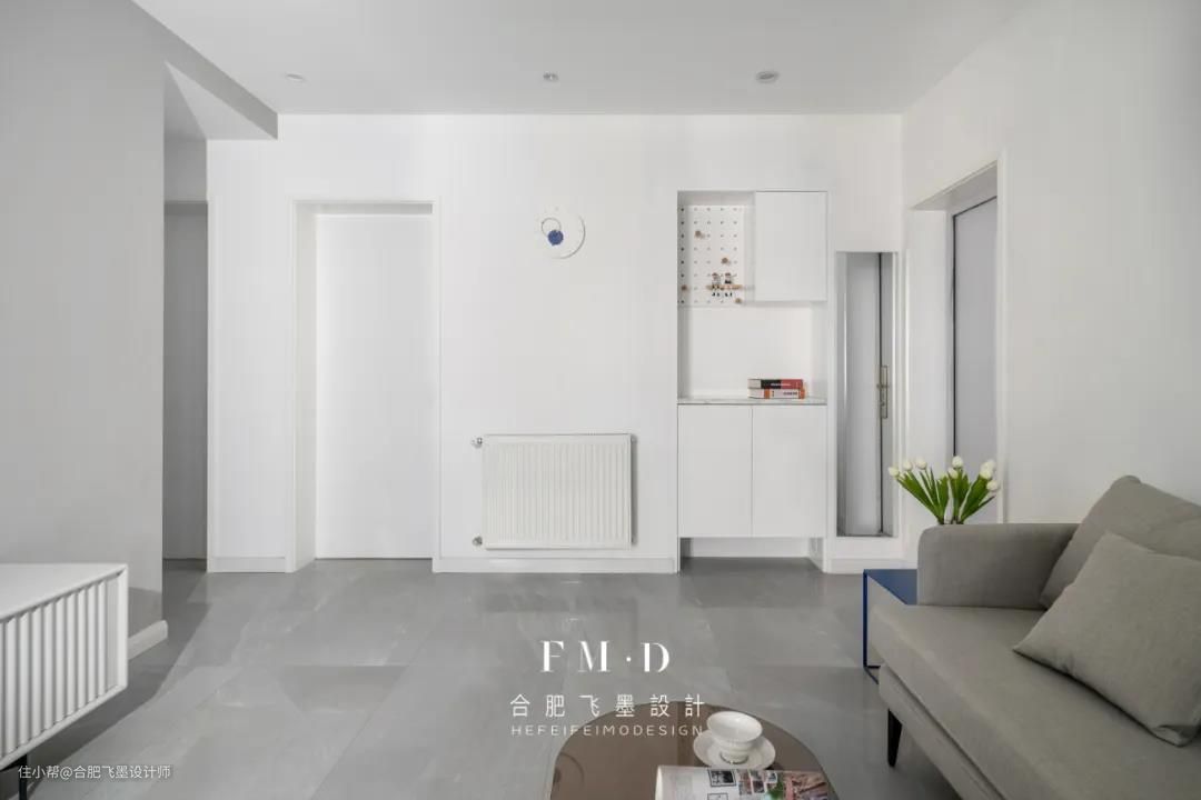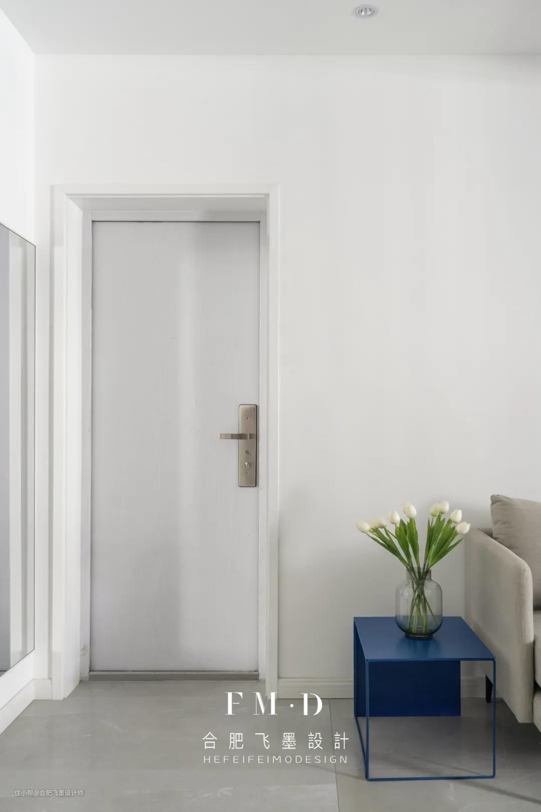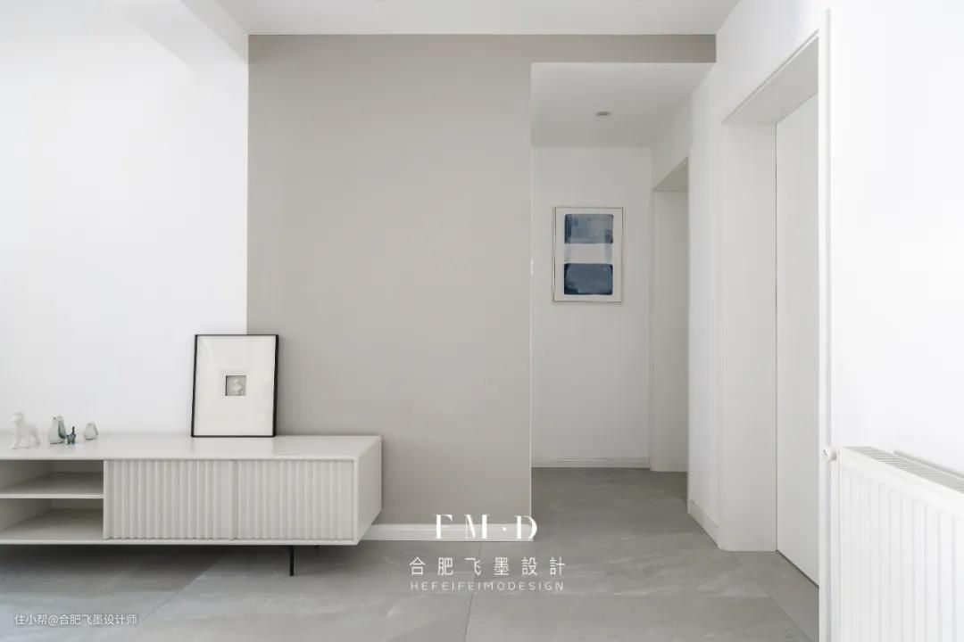 原始户型无玄关,入户即客厅,我们打掉了书房部分非承重墙的空间嵌入一个柜子实现玄关功能。白色玄关柜与墙面融为一体,丝毫不显突兀。