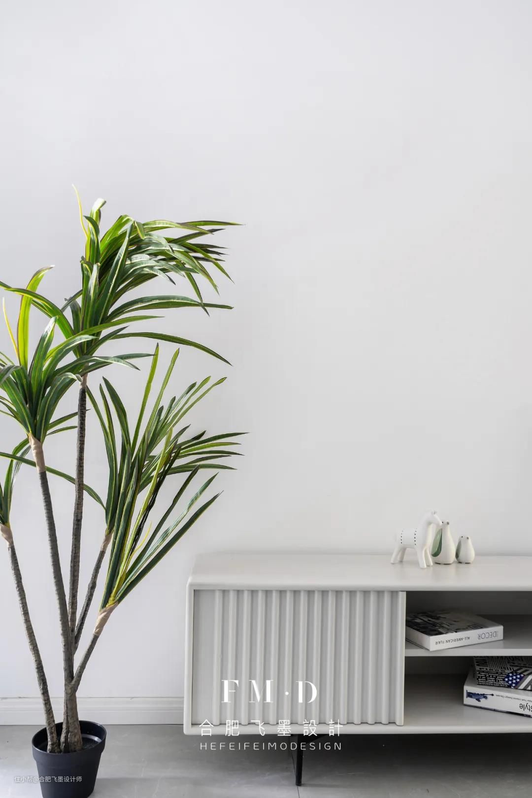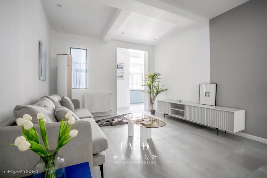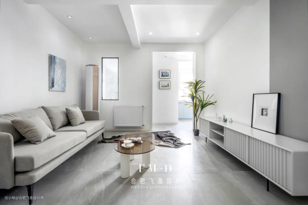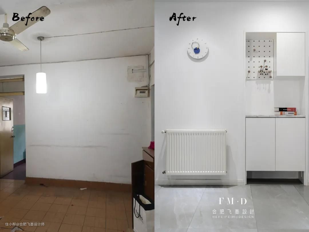 原始户型无玄关,入户即客厅,我们打掉了书房部分非承重墙的空间嵌入一个柜子实现玄关功能。白色玄关柜与墙面融为一体,丝毫不显突兀。
