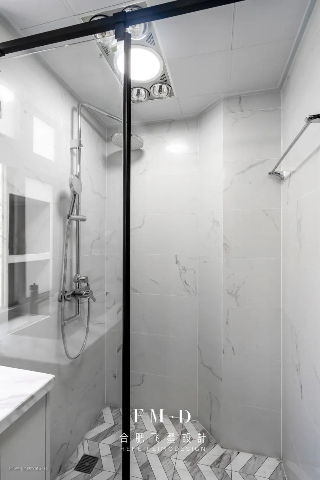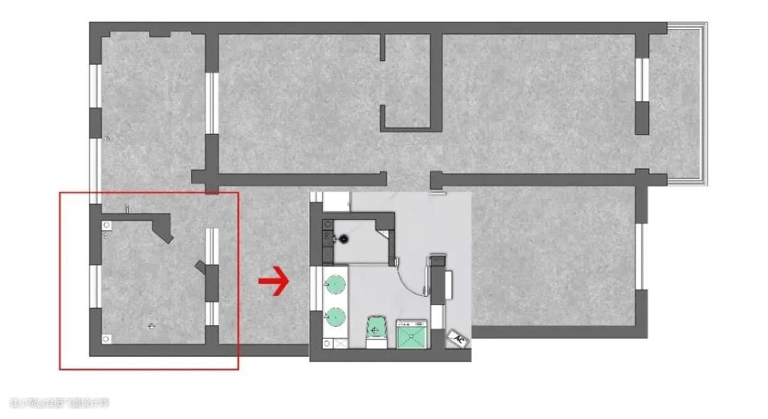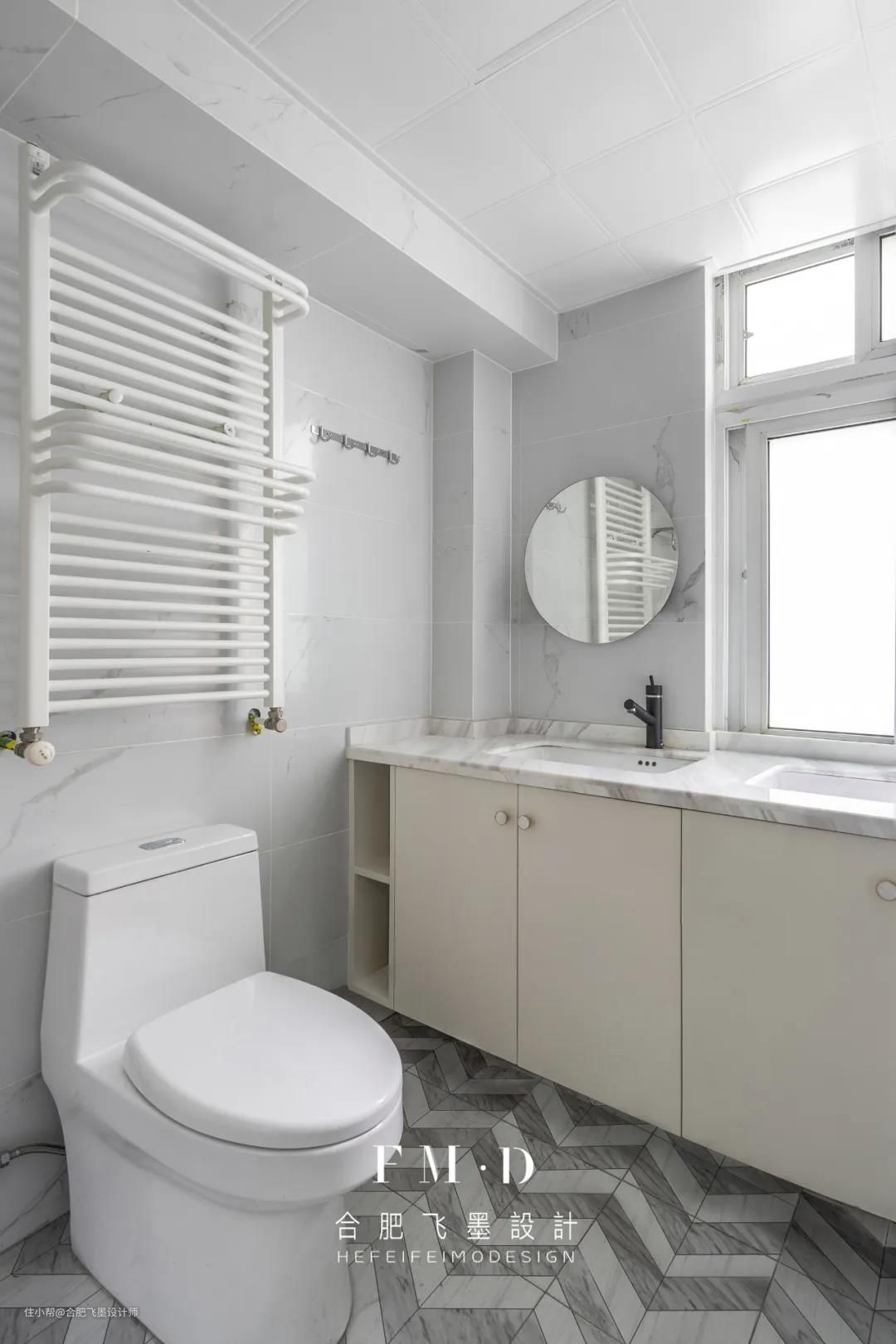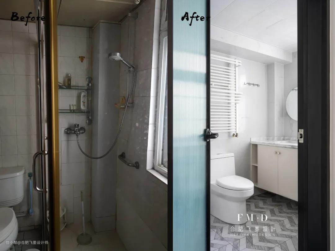 原始的卫生间空间,呈一个不规则的钻石型,更改了淋浴区的位置设计成干湿分离,并增加“洗漱池+洗衣池”双台盆设计,安置洗衣机,将洗衣动线缩至最短。