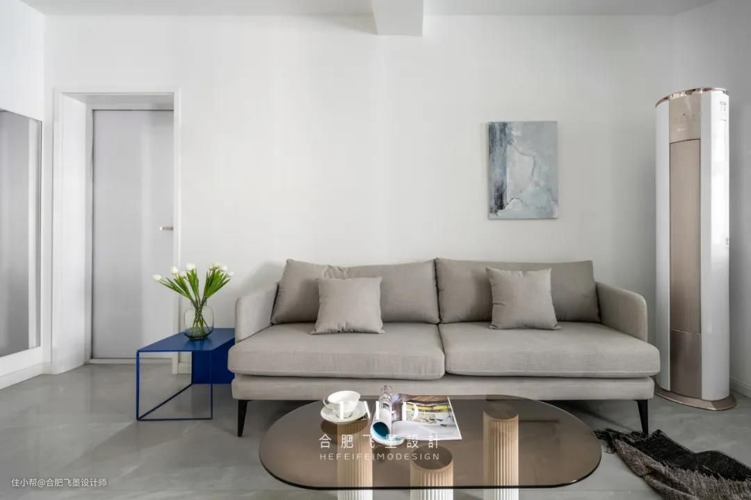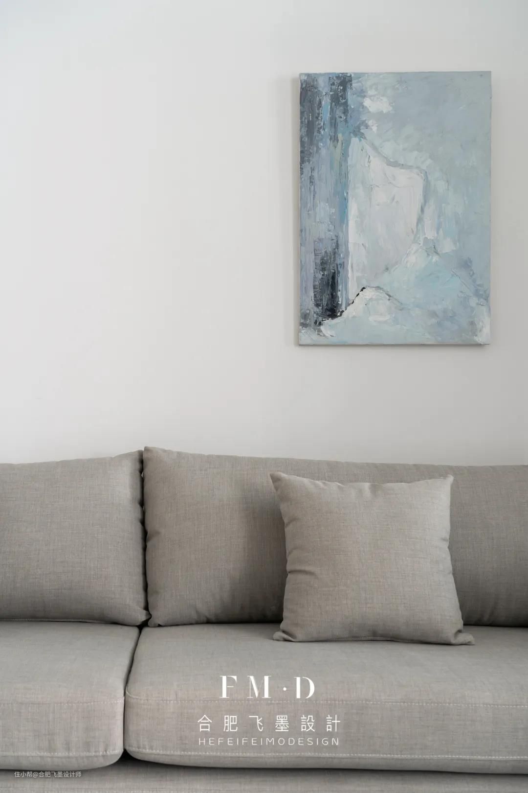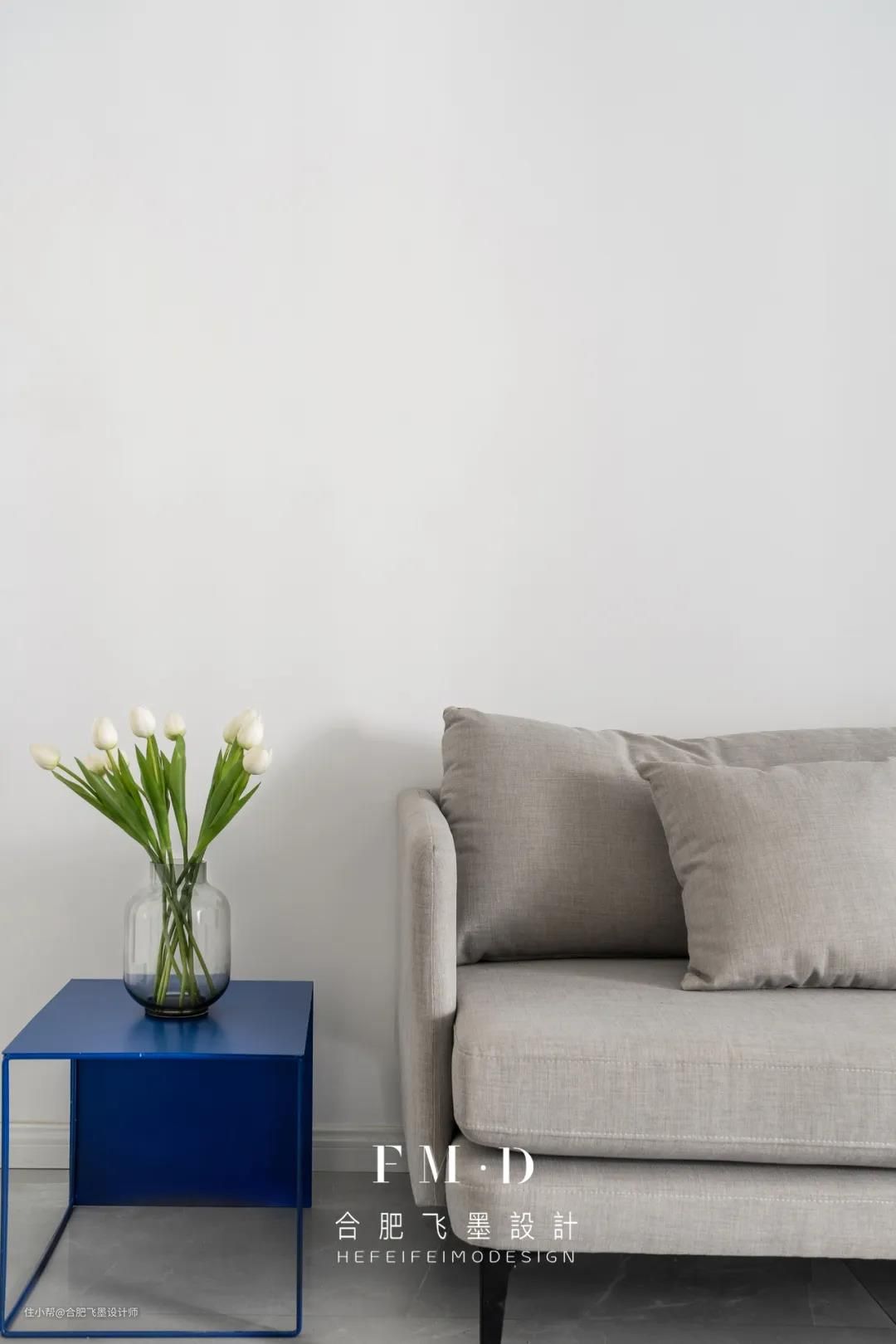 明媚的阳光穿过厨房进入客厅,泡一壶茶、选一本书,可以坐享一天的悠闲时光。在高级灰与白色的基调里,一幅蓝色的写意画与边几点缀其中,既中和了空间的温度又构造了美好生活的韵律。