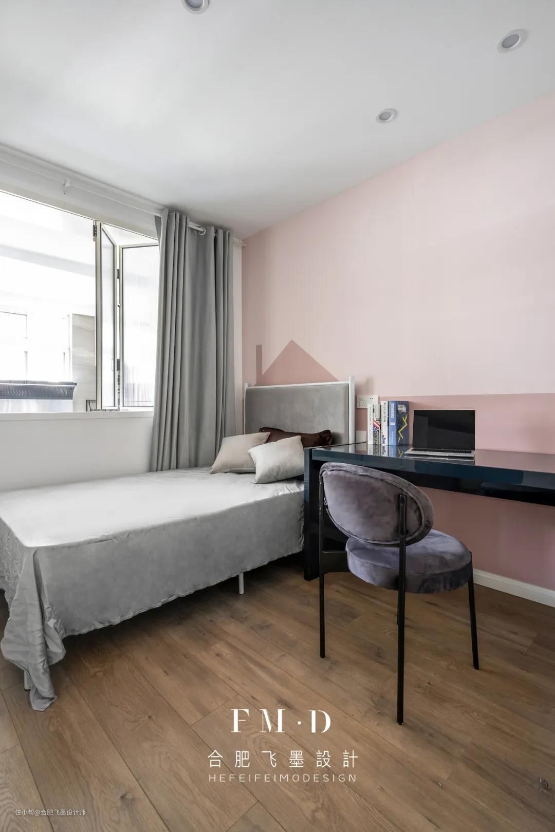 孩子的世界很简单,所以儿童房的设计也从简出发,但考虑孩子的年龄,我们将墙面刷成粉色,增加小房子造型,简洁有趣。