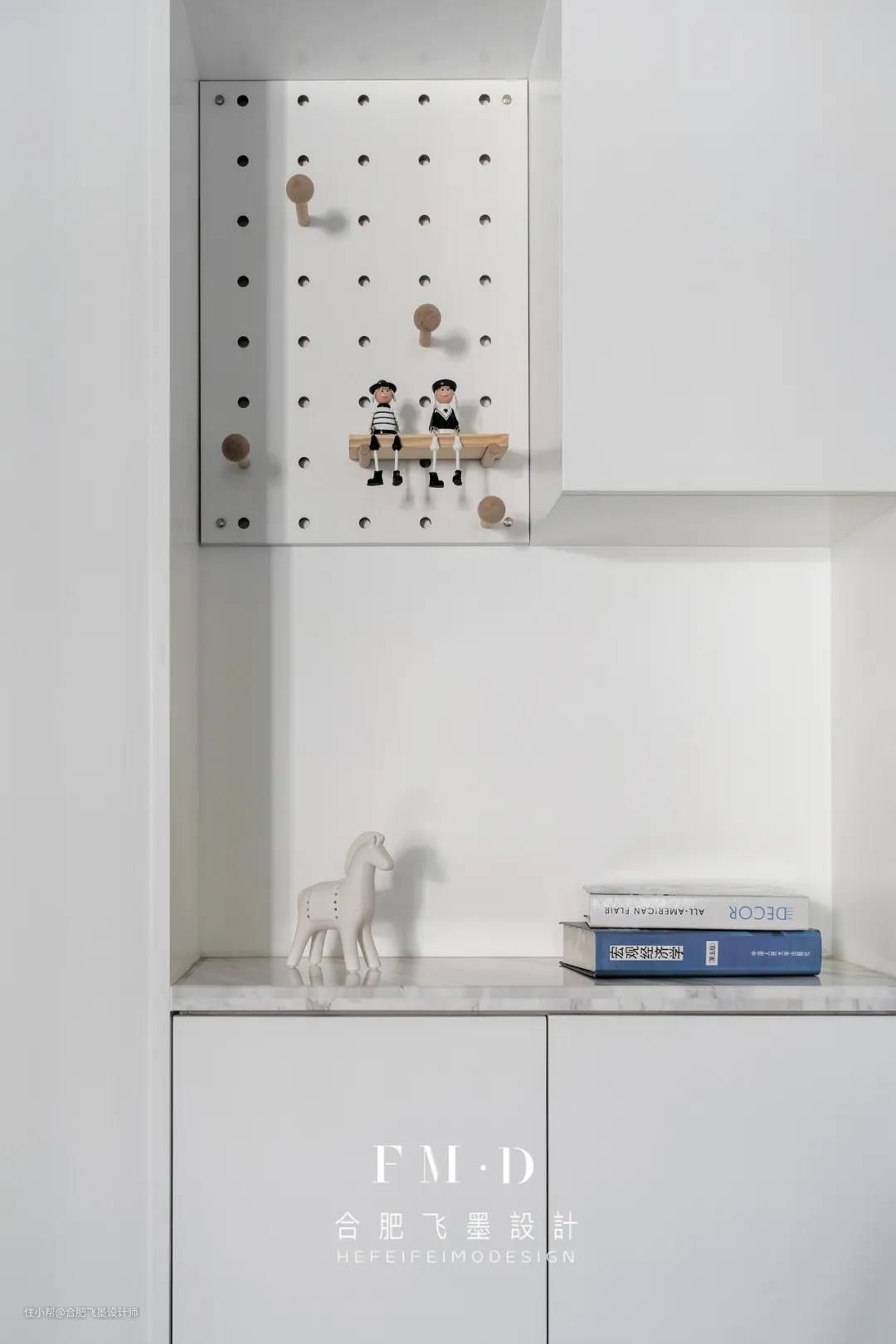 玄关柜上方的洞洞板挂雨伞钥匙等小件,中间的空格区放包包和刚拿回家的快递,底部留出了开放式的放鞋区。小小的入户空间,实用性极强。