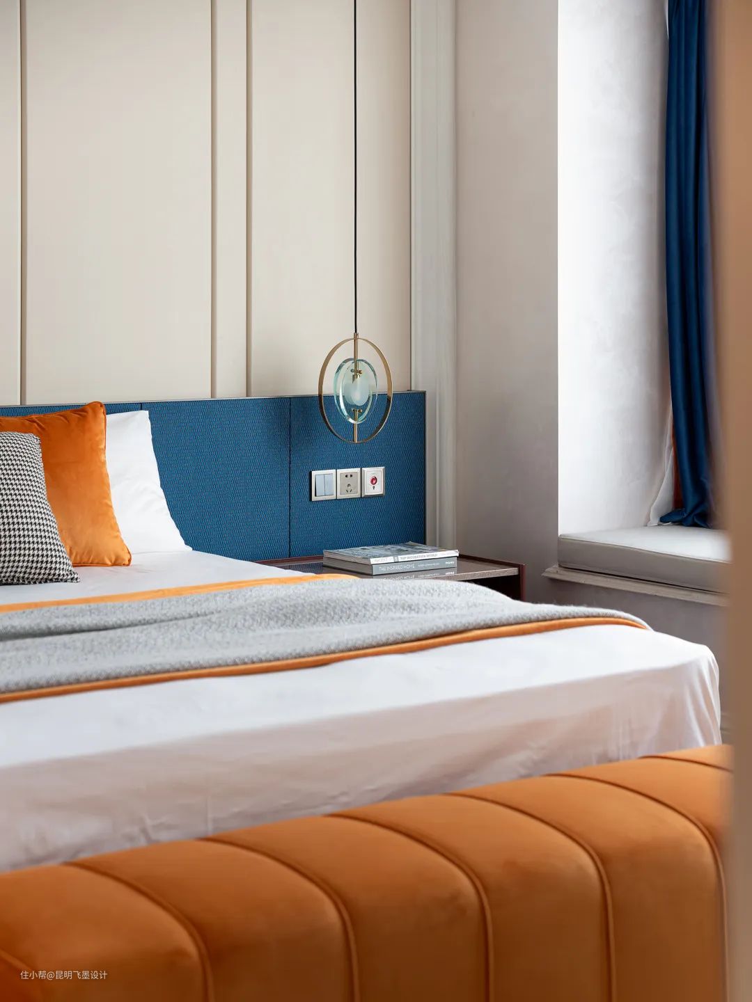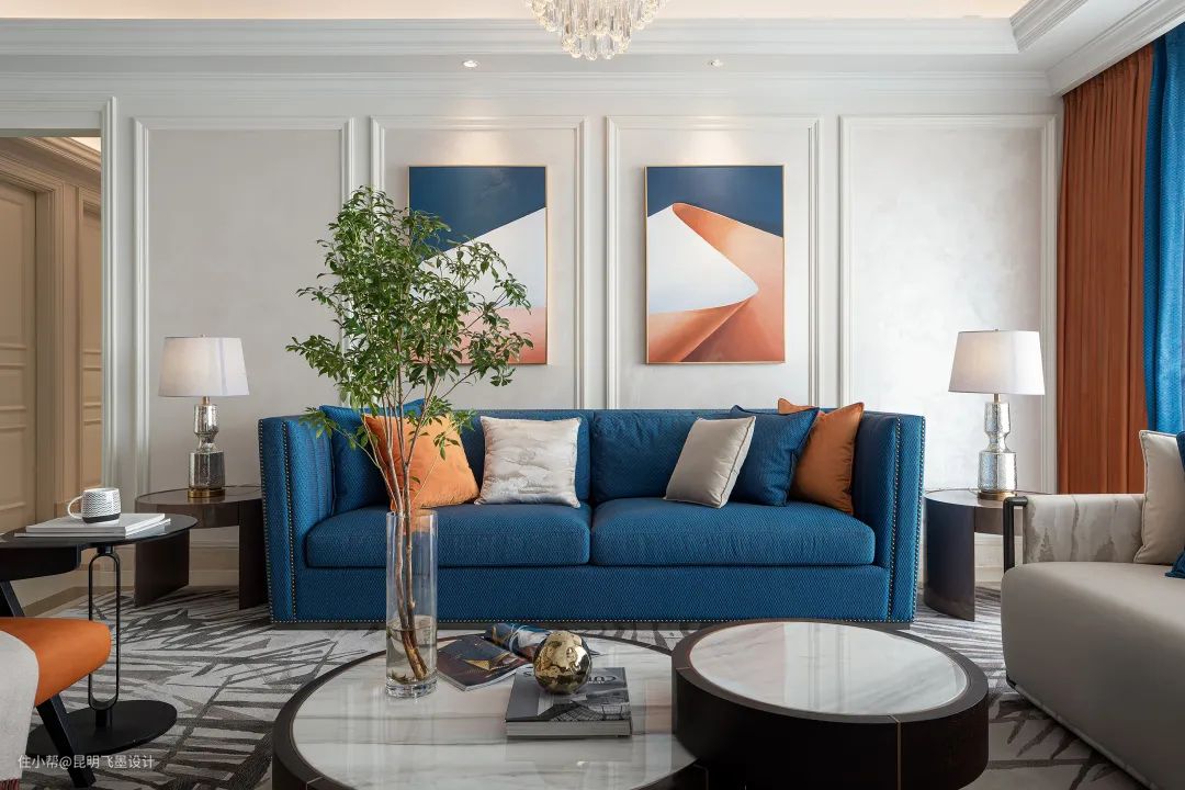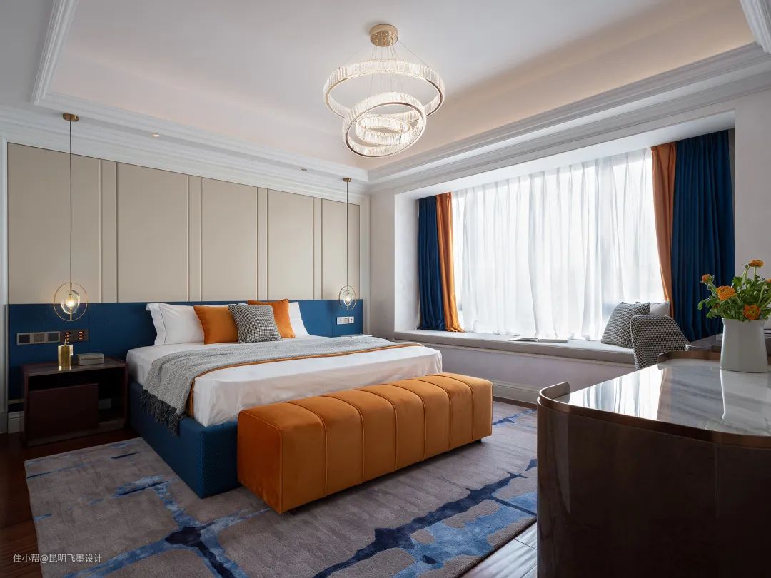 设计师以鲜明热烈的色彩与臻选的材质碰撞出全新的空间调性,宝蓝的华美邂逅明快的落日橙,轻奢个性、温暖雅致,让每一个场景生动而鲜活,仿若色彩研想室,让身处其中的人都能感受到色彩所传递的精神与力量。