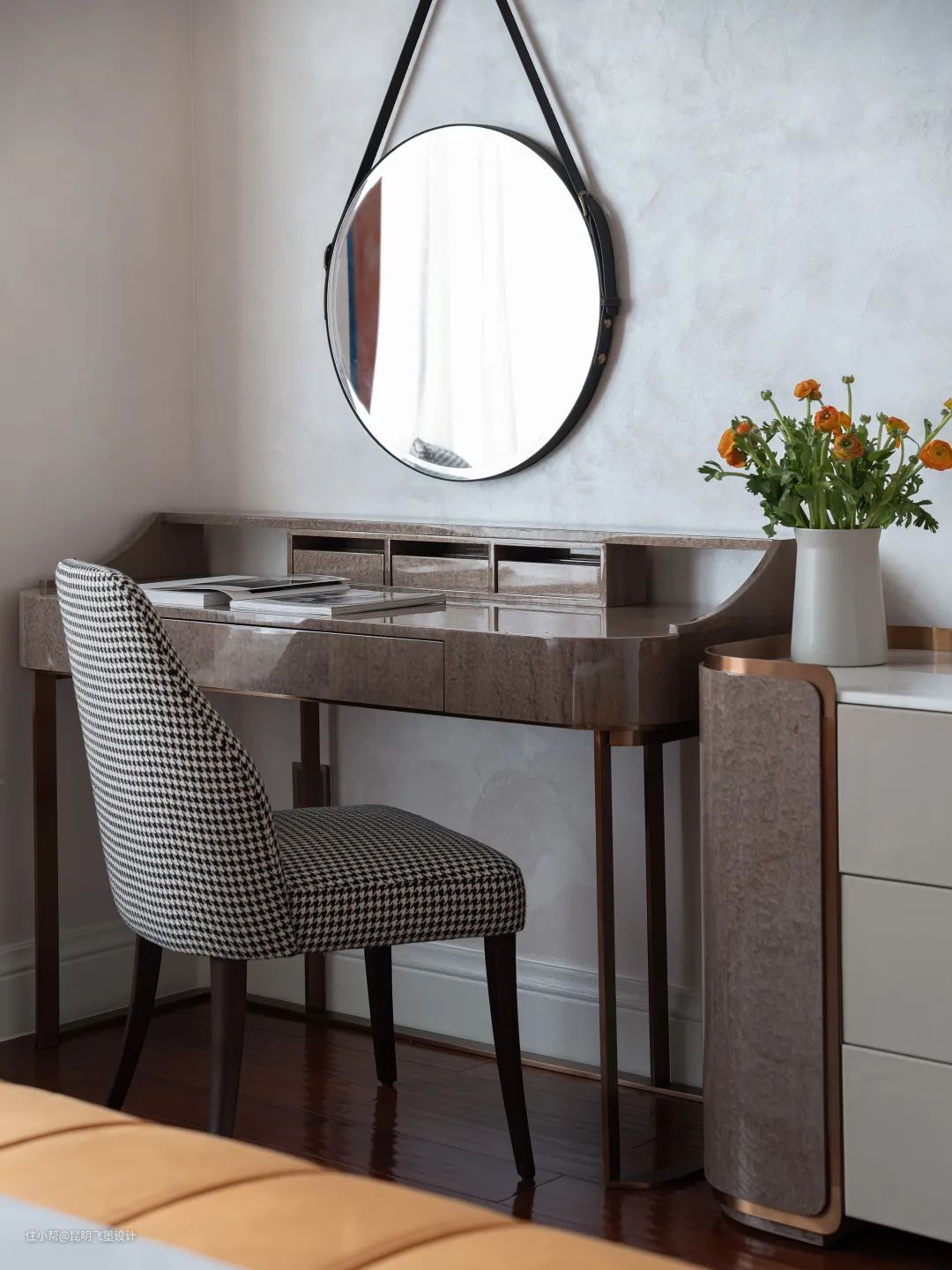 精心挑选的橙色冰箱与餐桌上清丽的花叶勾起飨食的欲念,古铜波纹装饰镜折射出静谧和乐的空间气质。