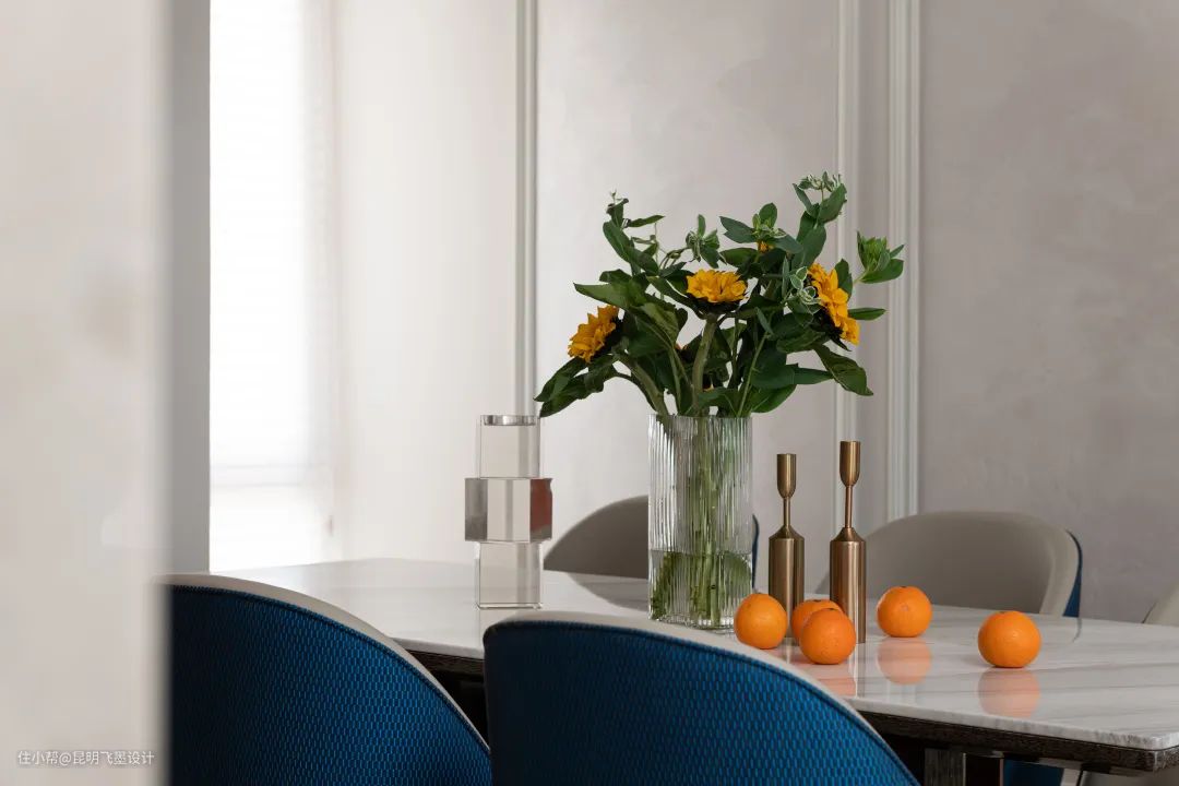 原户型中一成不变的泛黄陈旧感,由爽净简约的白色所替代。在轻盈的底色上,软饰加载典雅蓝和暖意橙,营造极具视觉冲击力的品质感。