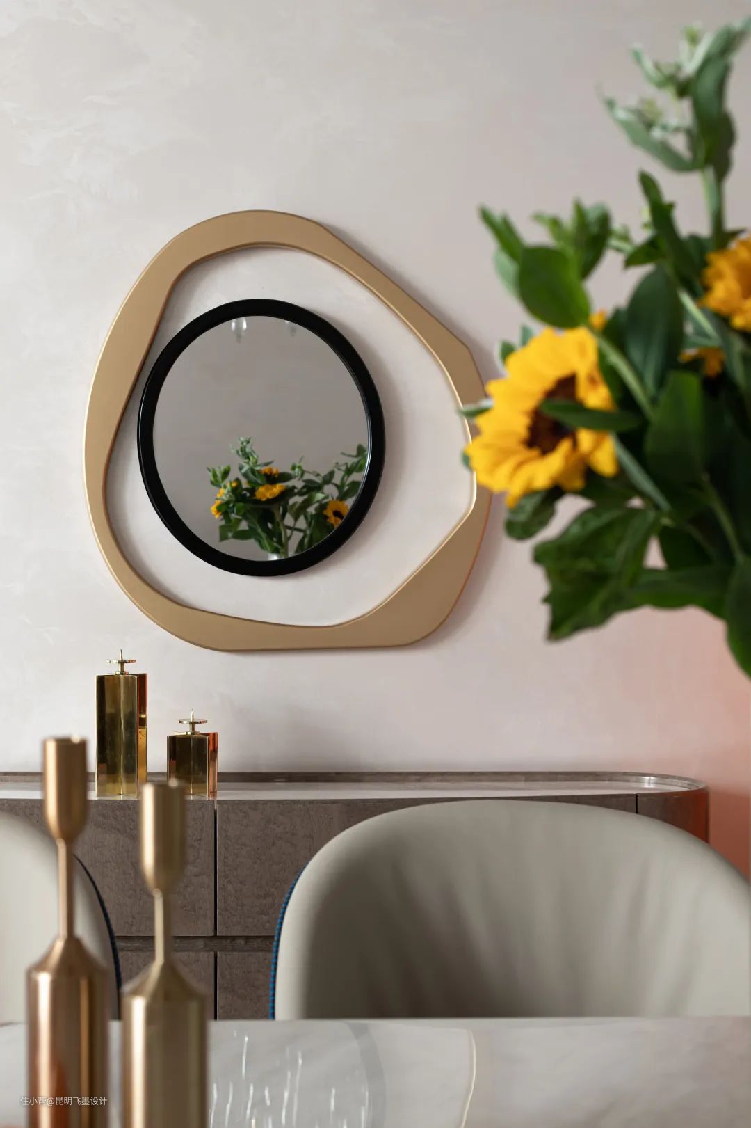 看似平常的物件,经由设计师的组合搭配,便拥有最隽永的温情日常。当光线透过纱窗挥洒在绿植、装饰画、金属器物上,空间多了一丝艺术气质。