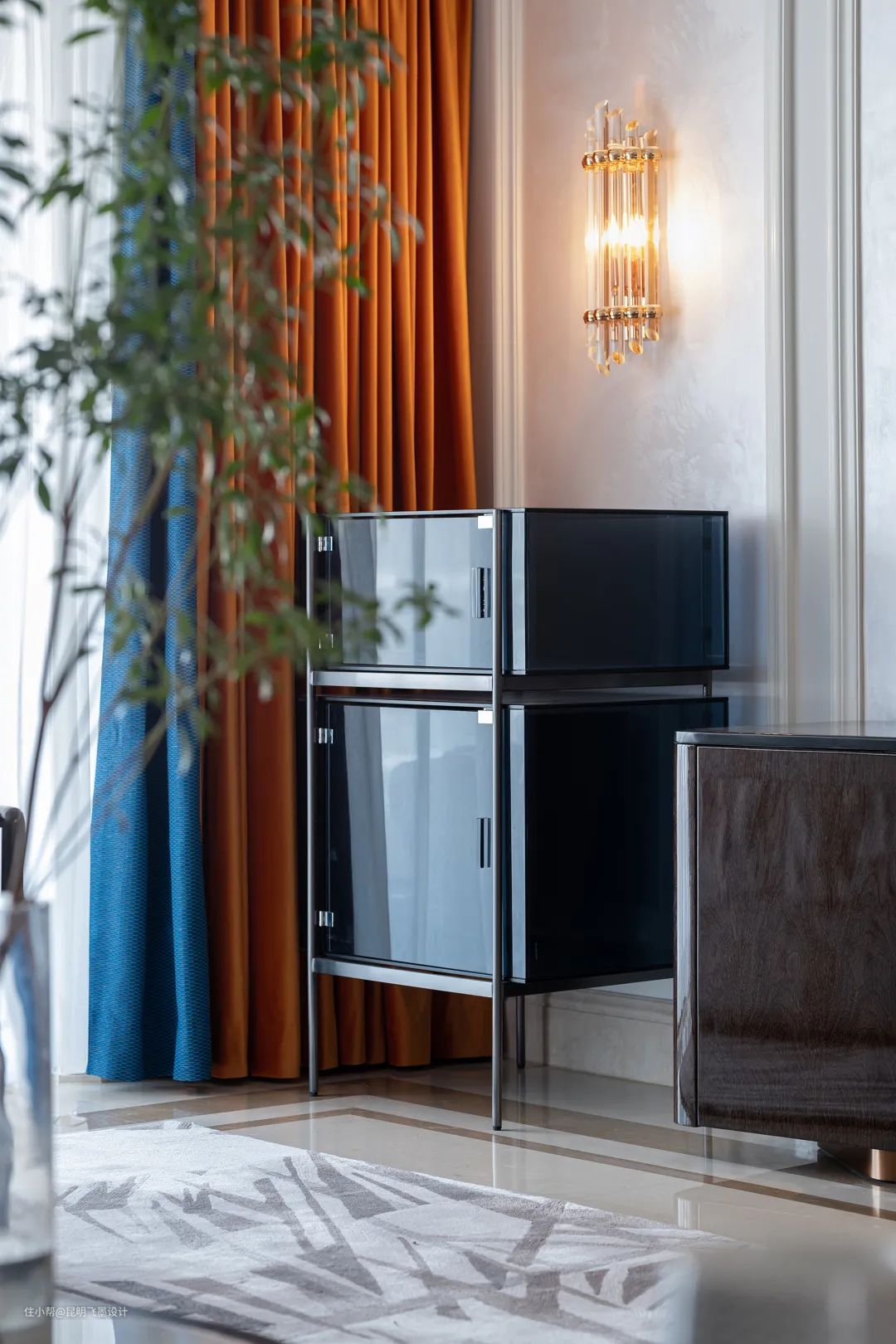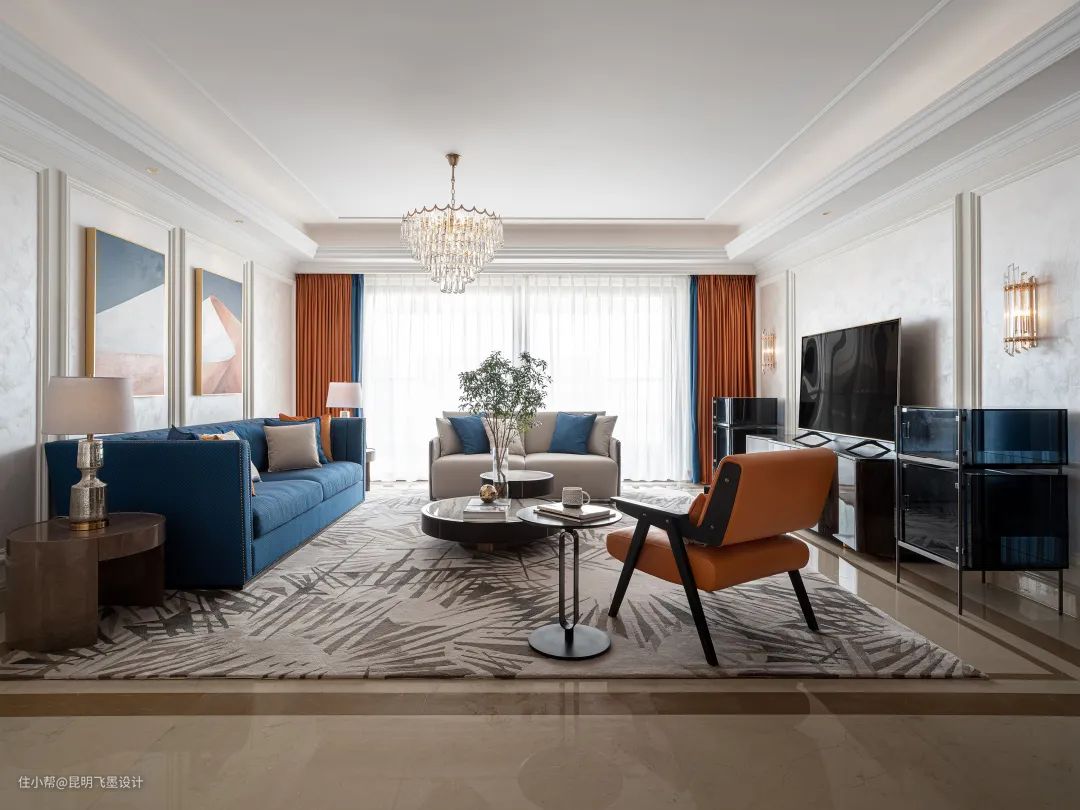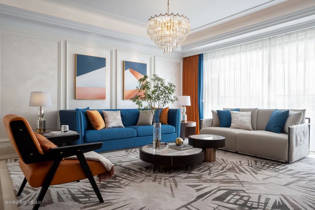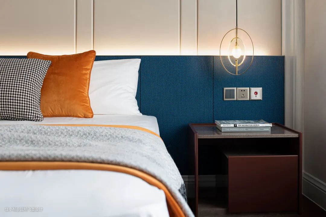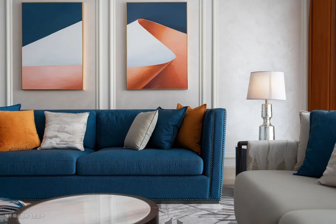 设计师以鲜明热烈的色彩与臻选的材质碰撞出全新的空间调性,宝蓝的华美邂逅明快的落日橙,轻奢个性、温暖雅致,让每一个场景生动而鲜活,仿若色彩研想室,让身处其中的人都能感受到色彩所传递的精神与力量。