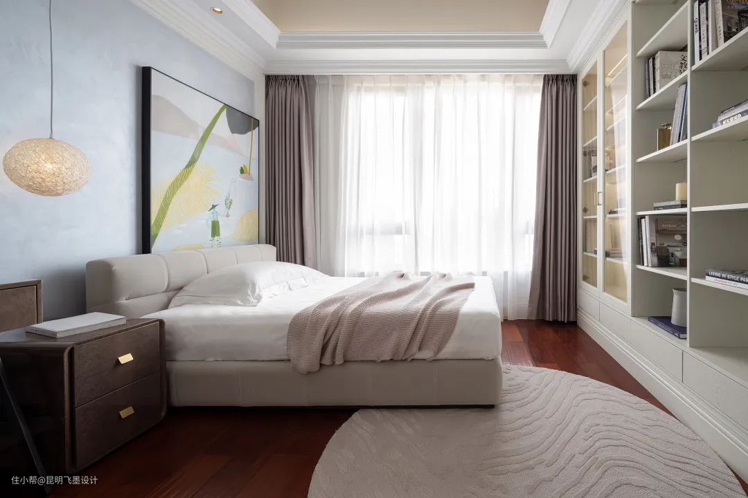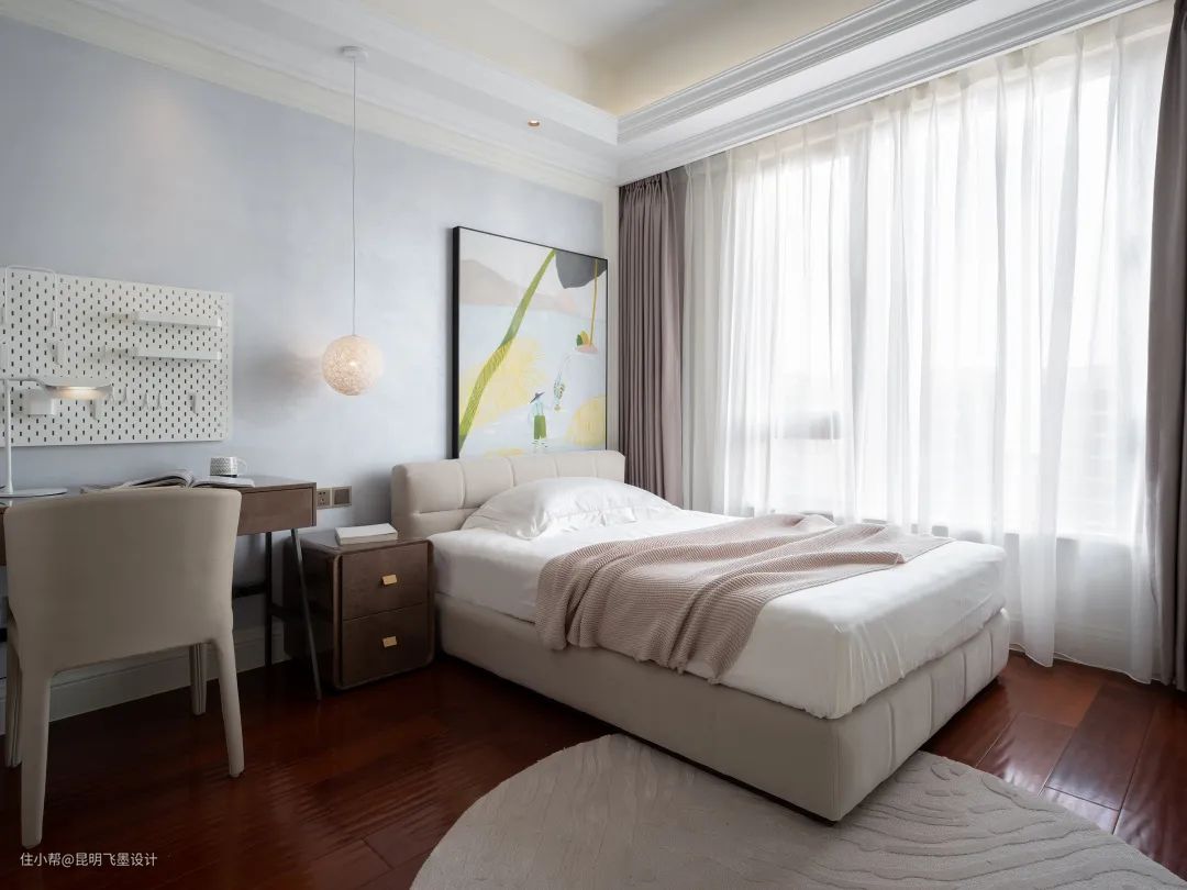 清新可爱的装饰画,粉蓝的柔和配比,肌理柔和的圆毯,设计师通过每一个小细节梳理出女孩的烂漫可人。