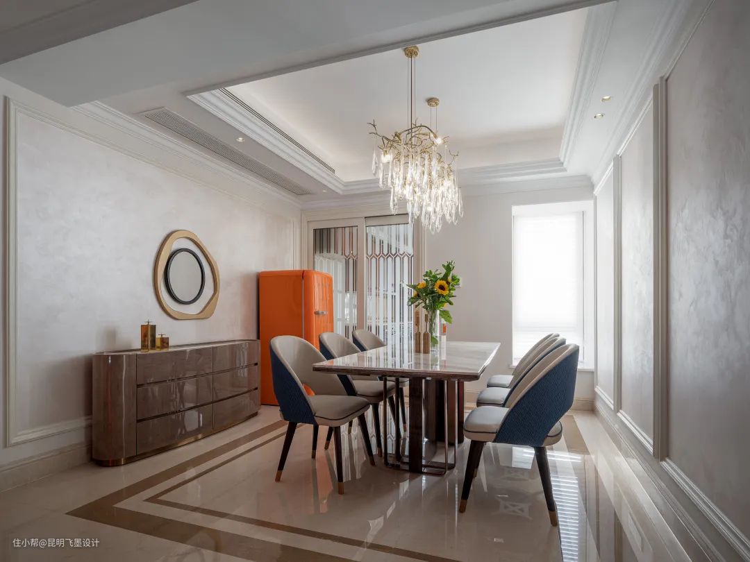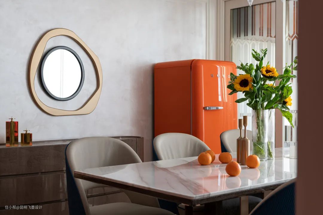 精心挑选的橙色冰箱与餐桌上清丽的花叶勾起飨食的欲念,古铜波纹装饰镜折射出静谧和乐的空间气质。
