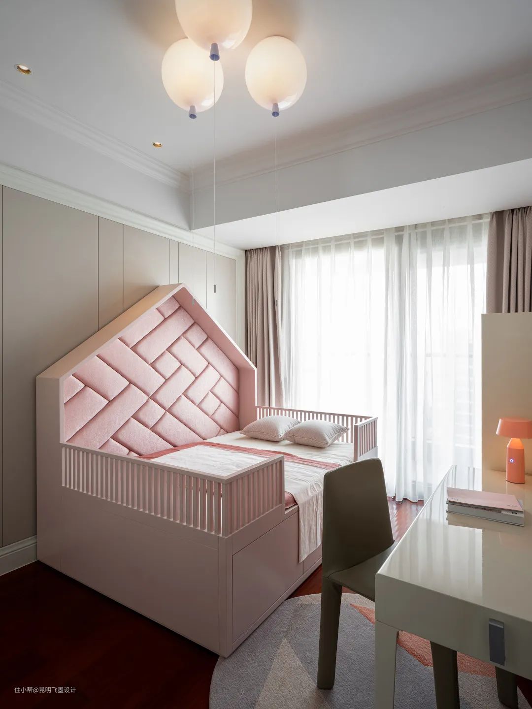 小女儿房设计承袭最柔和梦幻的樱语粉,活泼童趣的气球灯,编织屋顶的公主床,可以给孩子最好的呵护。转载:鸿艺源设计