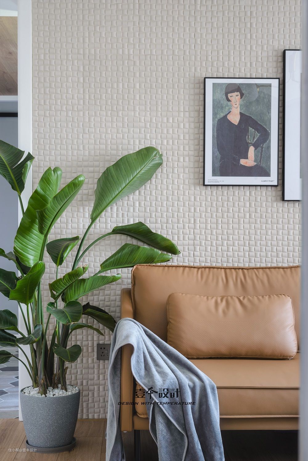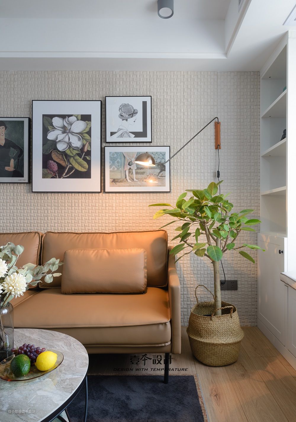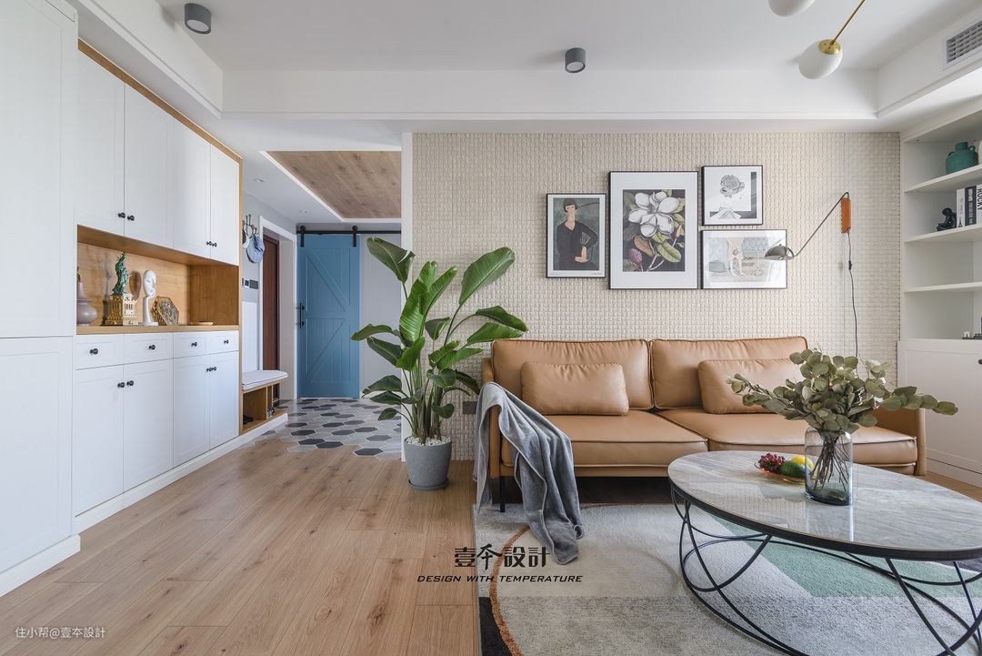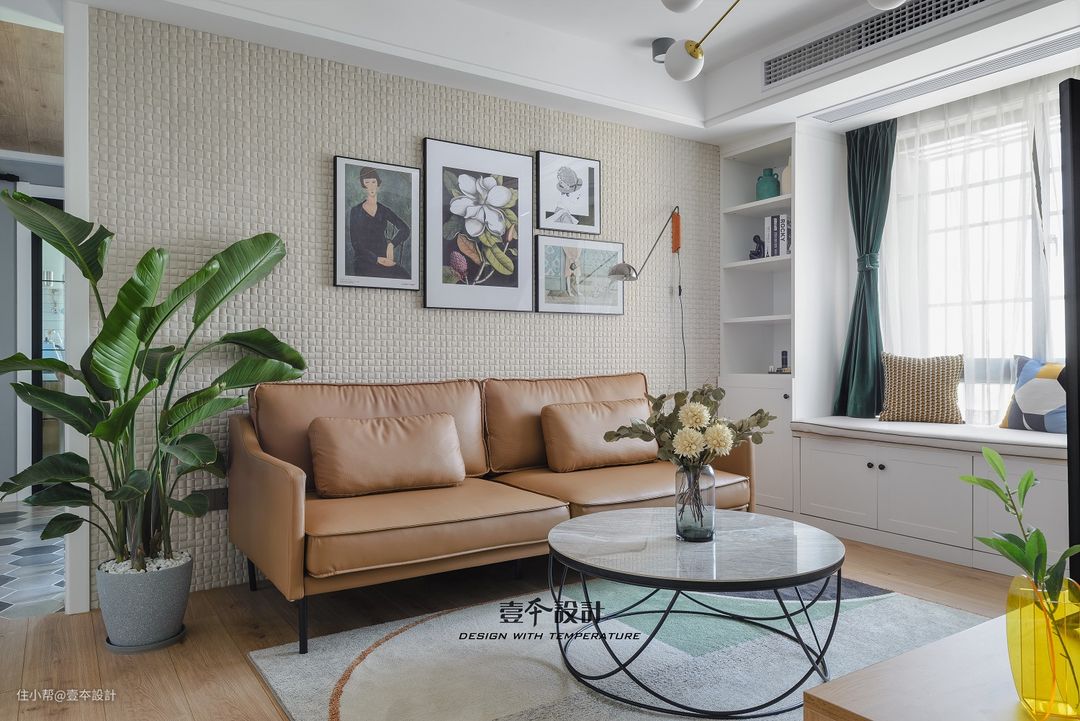 驼色沙发搭配米白色背景墙,点缀森系装饰画和绿色植物,空间十分小清新。