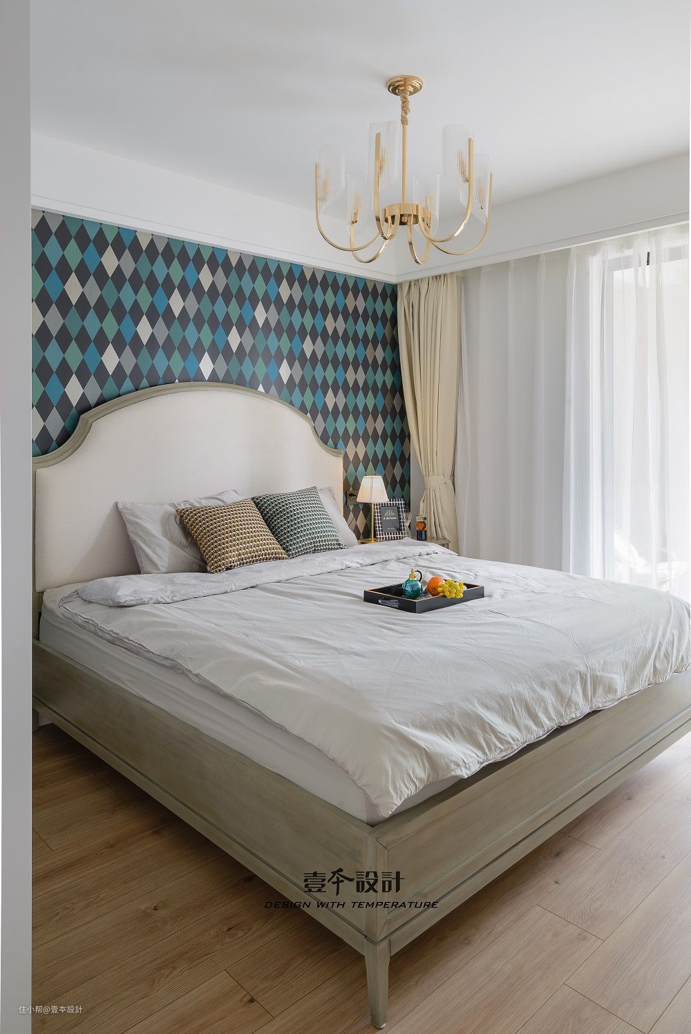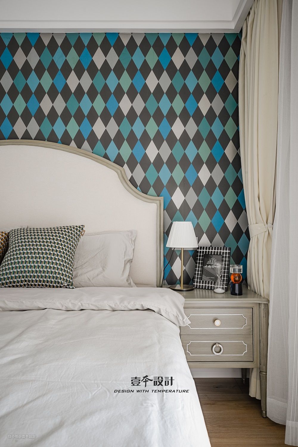 主卧床头背景采用充满时尚现代感的几何图案墙纸,相对纯色的墙面而言,几何图案墙纸让整个房间灵动跳跃起来。