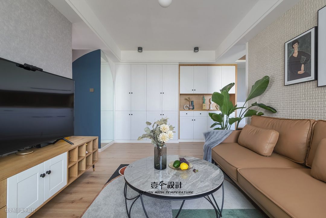因为女儿学舞蹈,过道处为她设置了一面镜子,镜子特意设计成半弧形,弧形延续到过道,过道刷半弧形的蓝色乳胶漆形成一个半圆造型,弧形设计为空间带来更多凝聚力和连续性。蓝色墙面搭配纯粹干净的白色柜体清爽而又温柔。