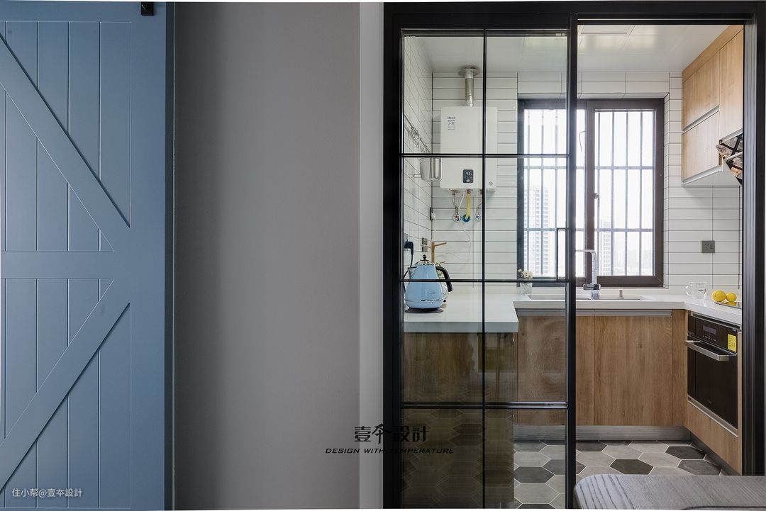 U字形厨房,洗切煮和备菜区域一应俱全。蓝色谷仓门,简洁又时尚。