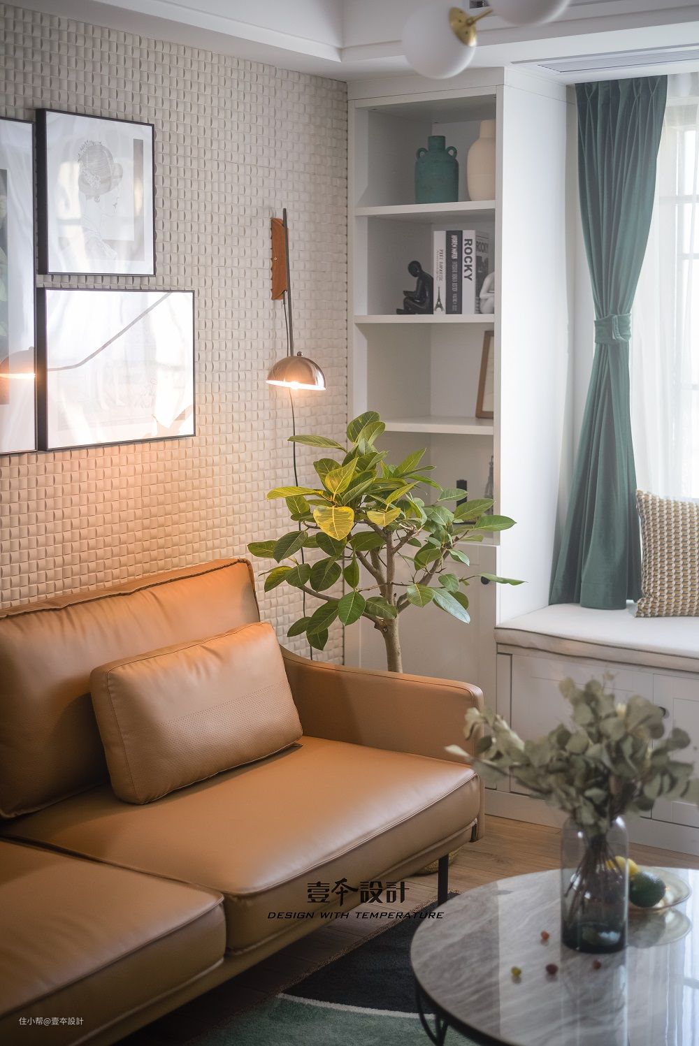 客厅墙面采用的是来自日本的骊住呼吸砖,自然的石面凹凸纹理,结合照明产生的阴影演绎出立体墙面质感,这种材质除了装饰效果,还可以吸附甲醛,净化空气。
