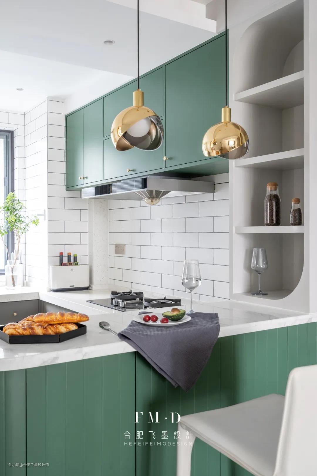 一个厨房,两个门洞,动线最优,既方便上菜,又丝毫不影响家人之间的互动交流;绿与灰的交织,抽屉与柜子的合作,让厨房无论是从颜值还是实用,都得到最大化的发挥。