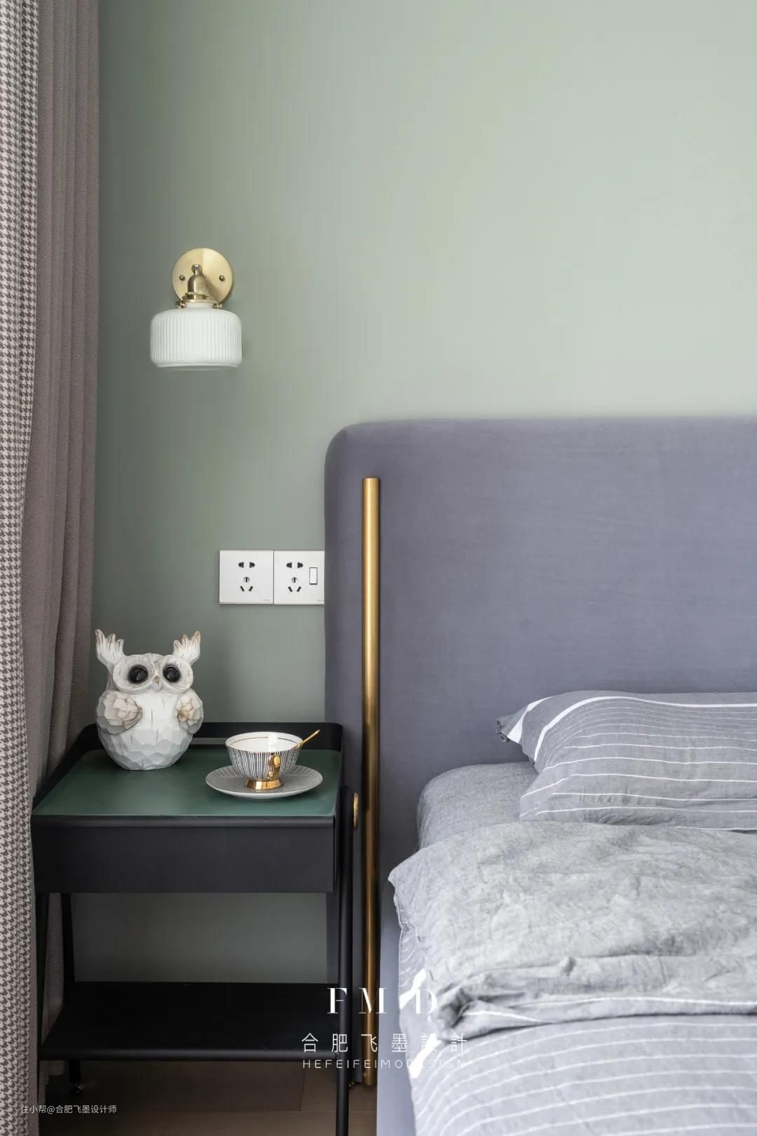 主卧的光线非常好,所以就做了一个灰色调+浅绿色的空间,整体舒适清新,窗帘后的飘窗作为一个休闲区来用,外加一个做了收纳的小凹洞,让主卧的功能性更加丰满。